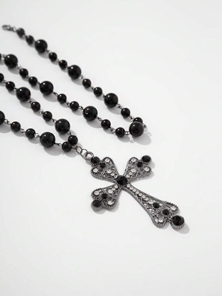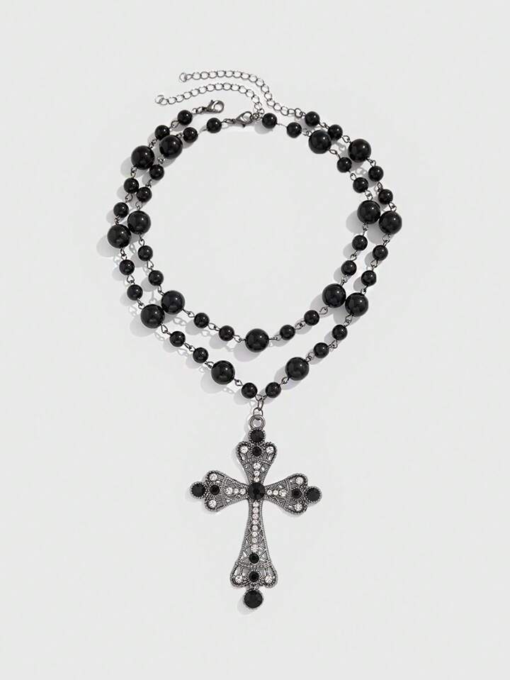 Grunge Punk 2pcs Cross Pendant & Beaded Necklace Set