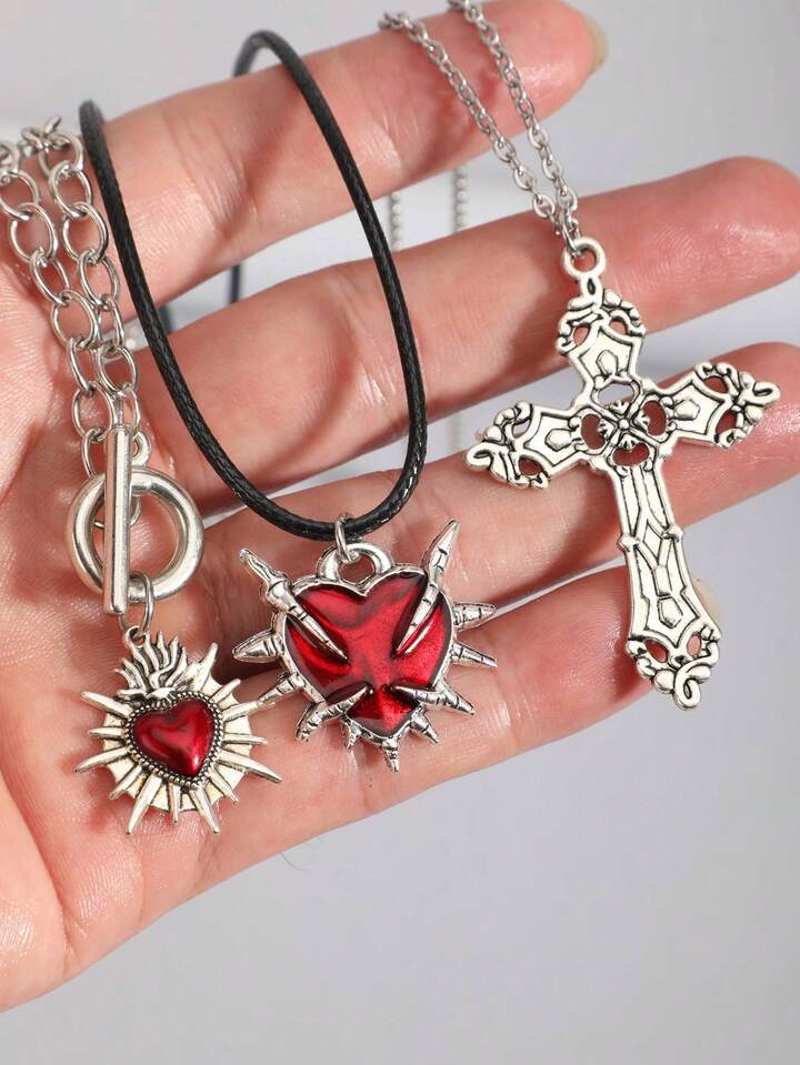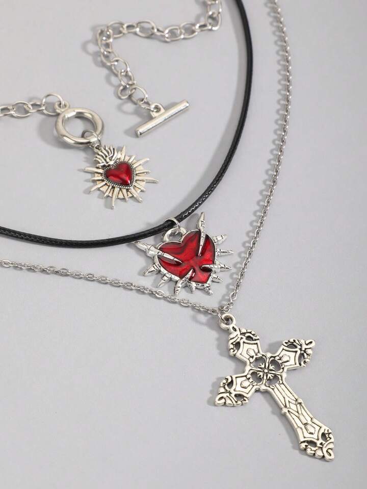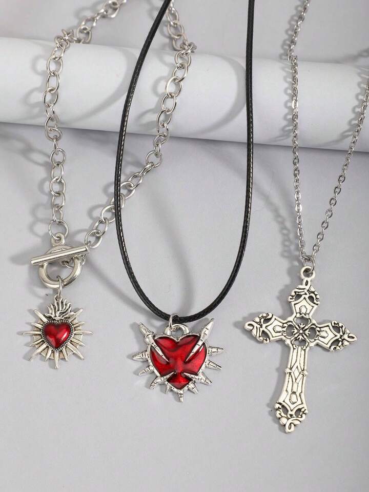 Grunge Punk 3pcs Gothic Style Black Beaded, Red Thorn Rose, Cross & Heart Pendant Necklace Set For Women