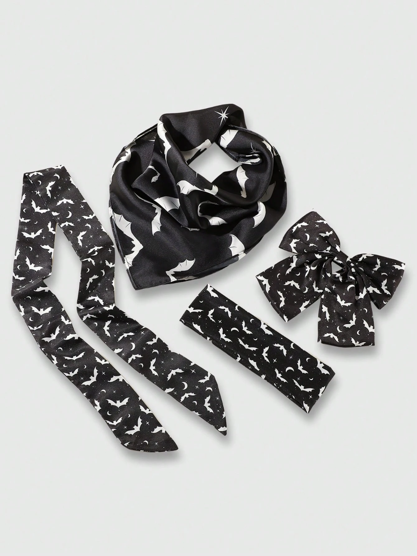 Grunge Punk 4pcs Set: Black Bat Print Headband + Hair Clips + Scarf Accessories Collection, Y2K Street Aesthetic Suitable For Daily Life, Street Parties And More For Women, Halloween
