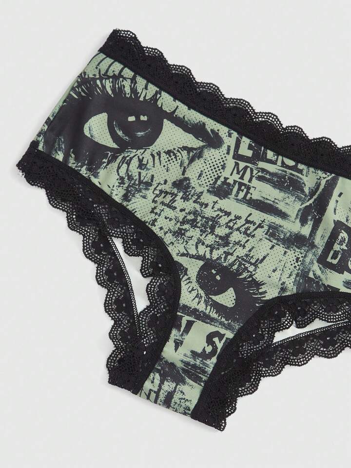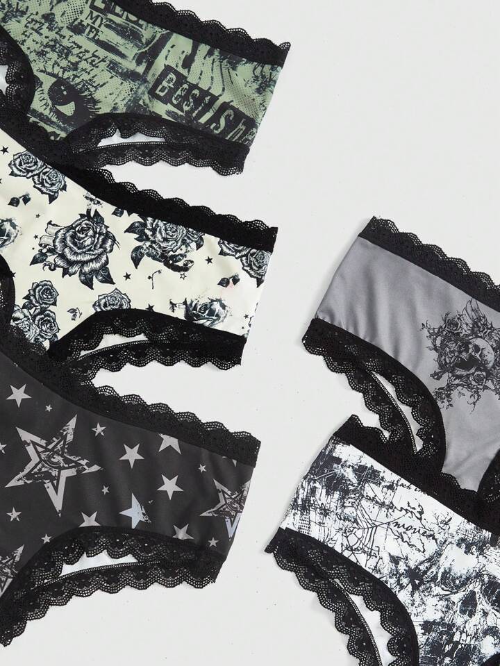 Grunge Punk 5pcs/Set Dark Punk Style Lace Trim Triangle Panties With Printed Roses, Skulls, Stars, Eyes, Wings