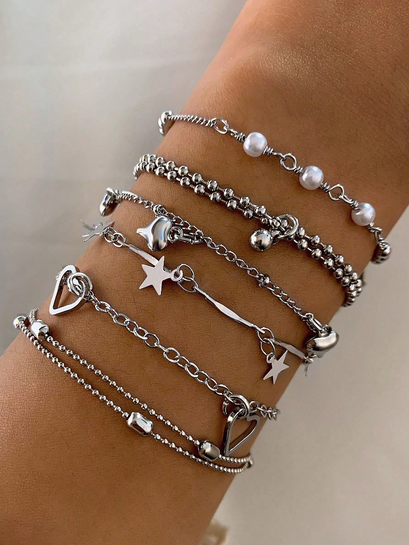 Grunge Punk 6 Pieces Set Of Simple And Fashionable Alloy Five-Pointed Star Tassels Hollow Love Three-Dimensional Heart Tassel Bracelet Set Female Date Gift