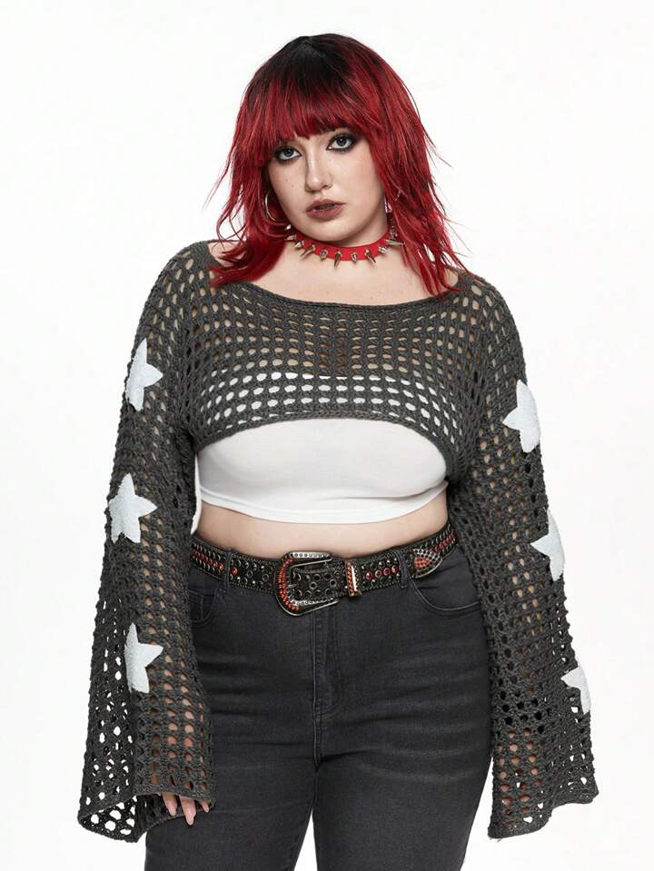 Grunge Punk Back To School Plus Size Women Star Embroidery Flare Sleeve Hollow Out Knit Cropped Cover Up