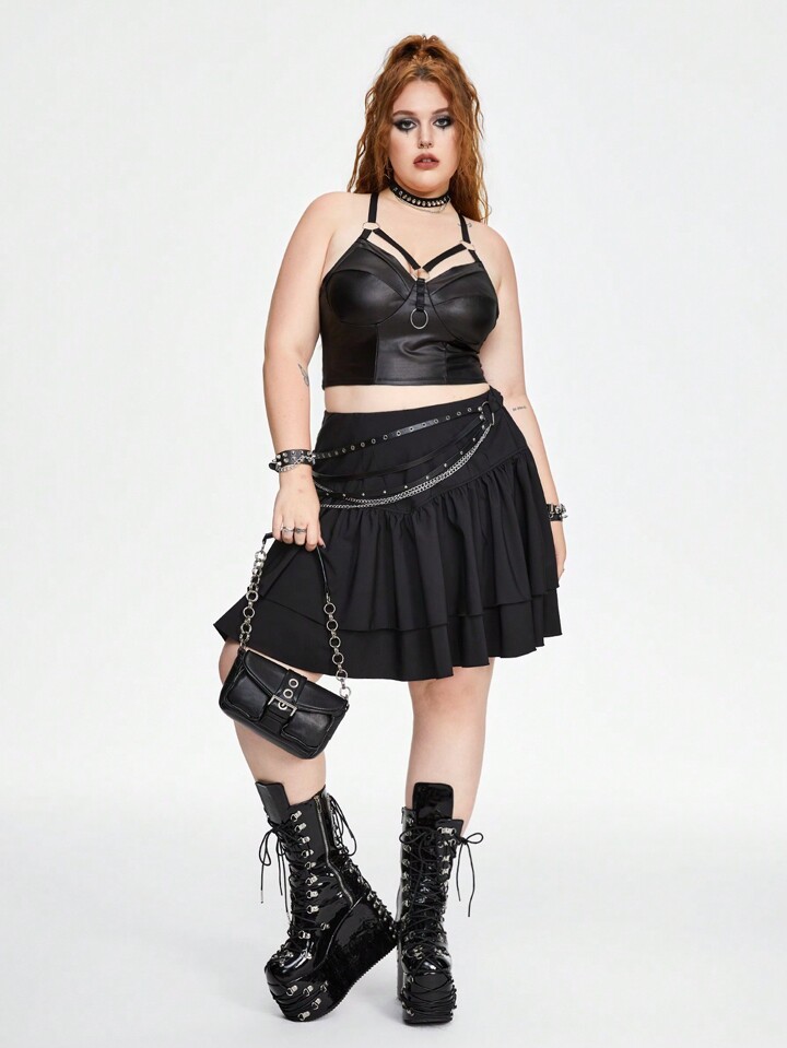 Grunge Punk Black Punk Style Belted A-Line Plus Size Cake Skirt, Flattering For Your Figure