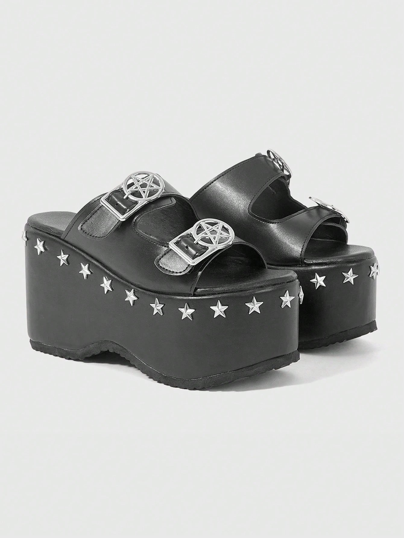Grunge Punk Black Sandals Summer Open Toe Rhinestone Shiny Y2K Gothic Shoes For Women, Transparent Crystal Sweet Platform Wedge Sandals, Halloween