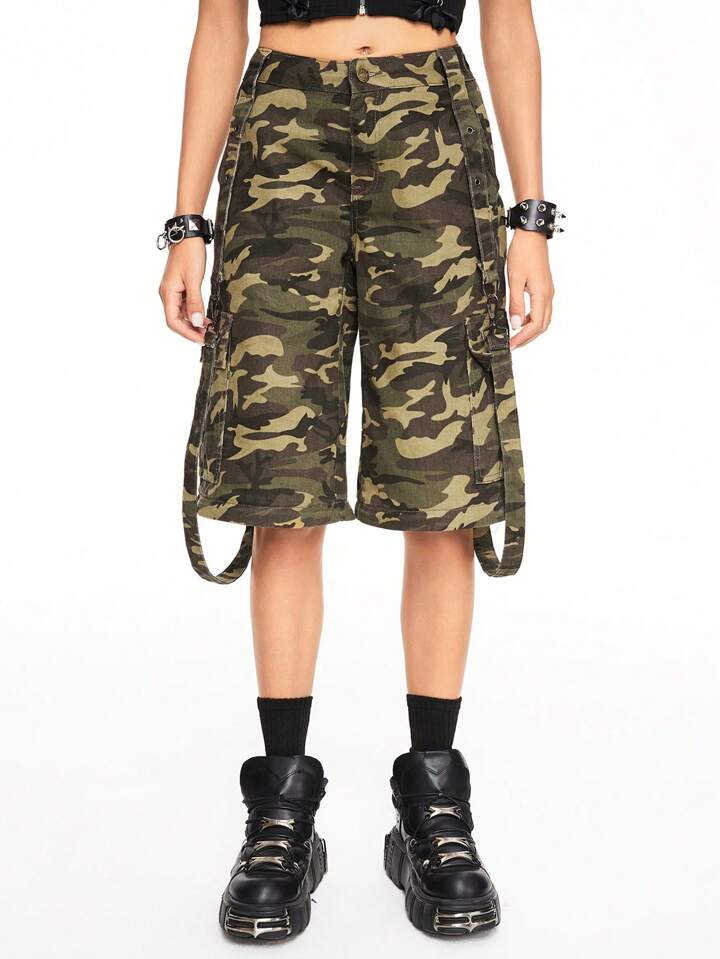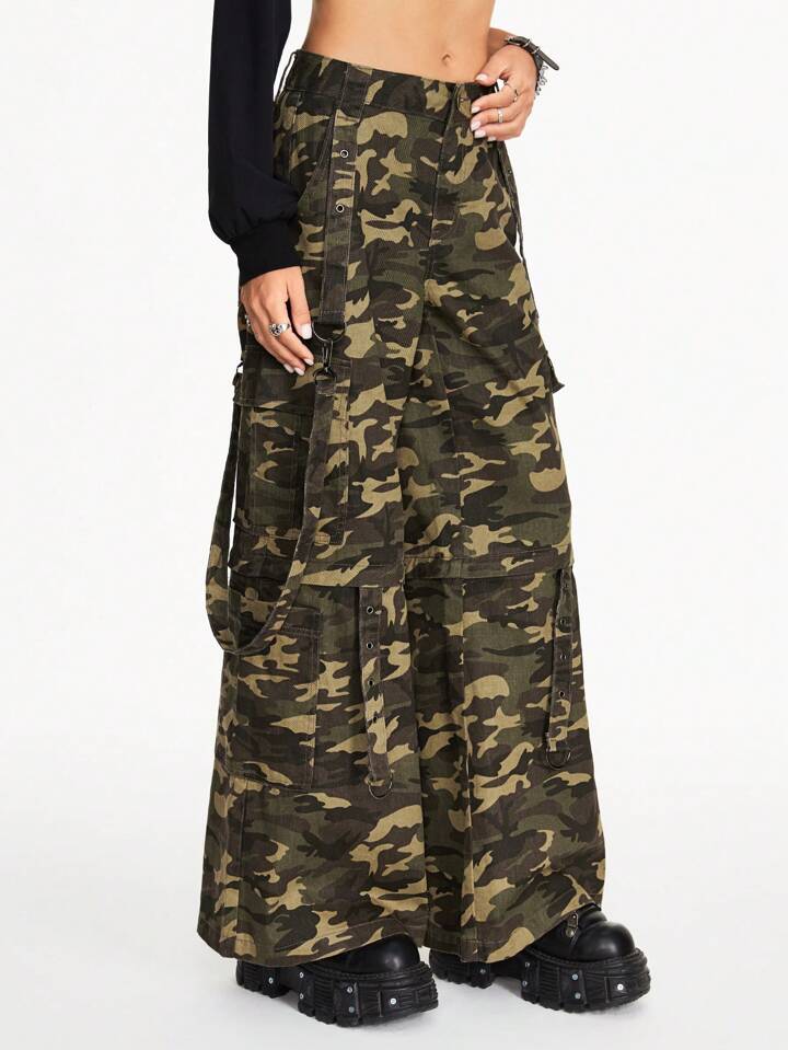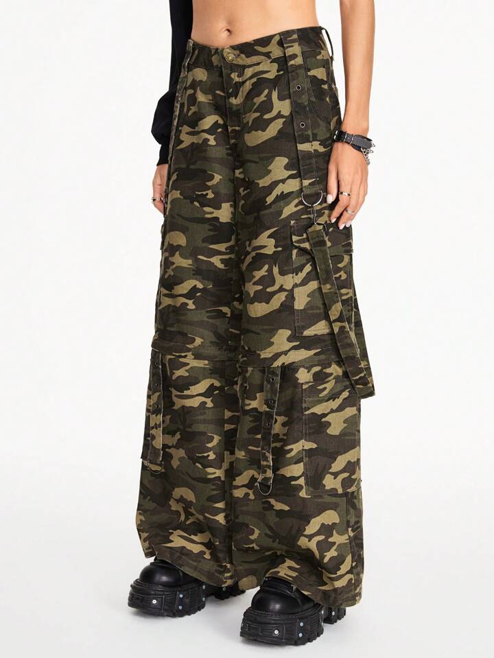 Grunge Punk Camouflage Print Detachable Baggy Cargo Pants, Versatile Wide Leg, School