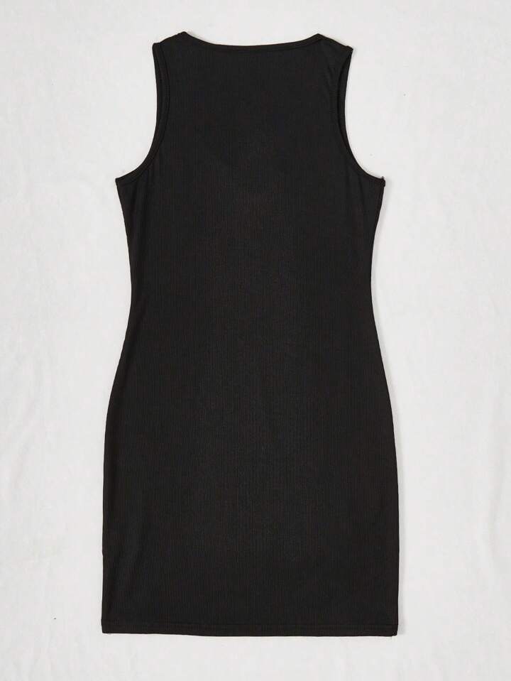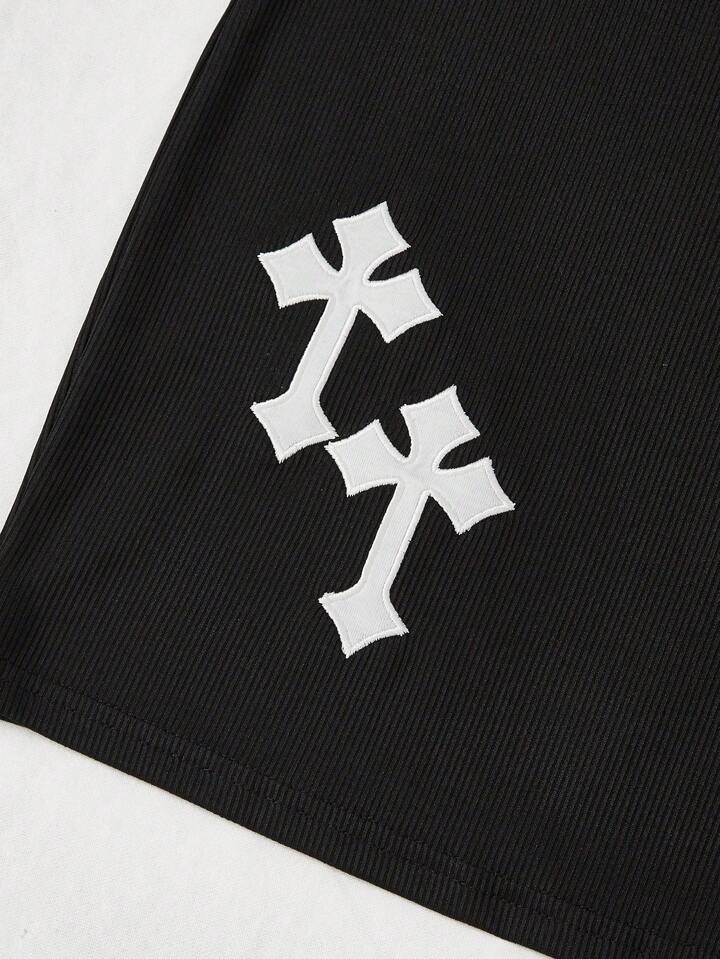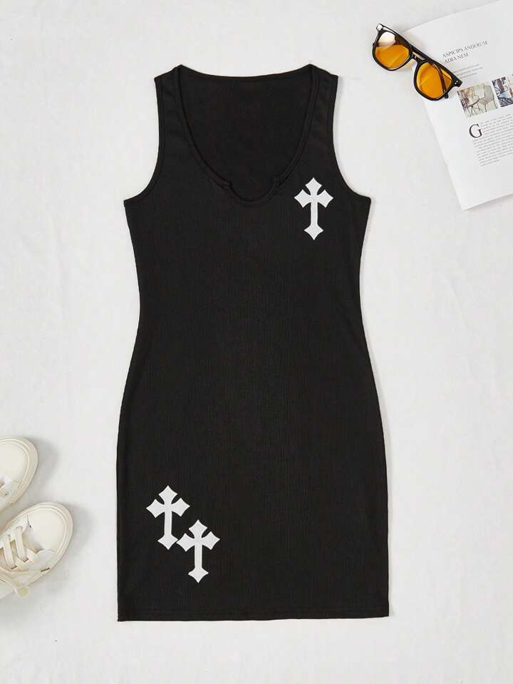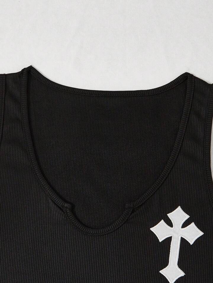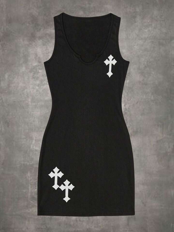 Grunge Punk Cross Embroidery Ribbed Tank Dress, School