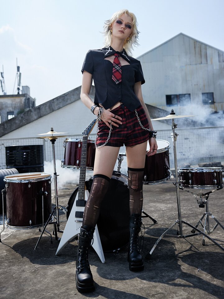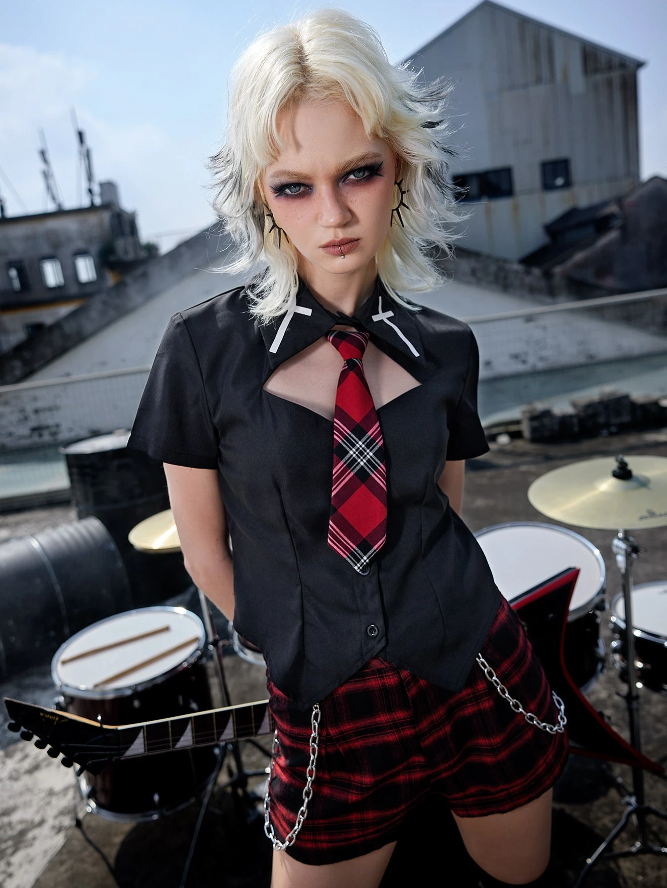 Grunge Punk Cross Print Cut Out Button Front Shirt & Neck Tie