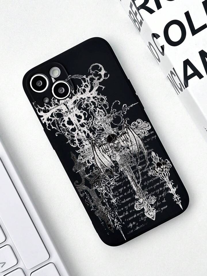 Grunge Punk Cross & Skull Letter Print Black Phone Case, Compatible With IPhone 16/ IPhone 16 Plus/ IPhone 16 Pro/ IPhone 16 Pro Max And Other IPhone Series