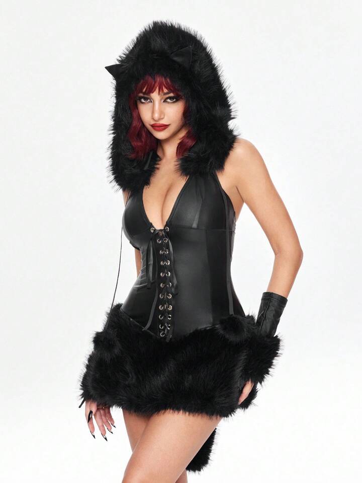 Grunge Punk Fashionable Criss-Cross Strap Plush Trim Costume Outfit