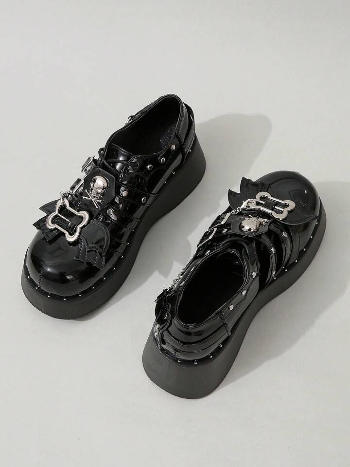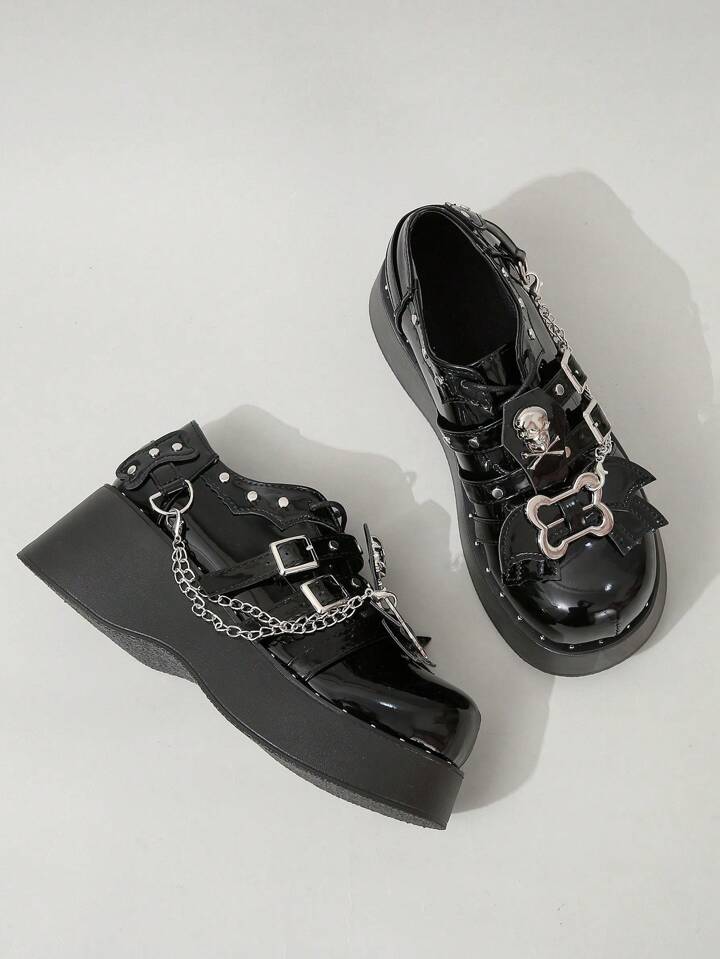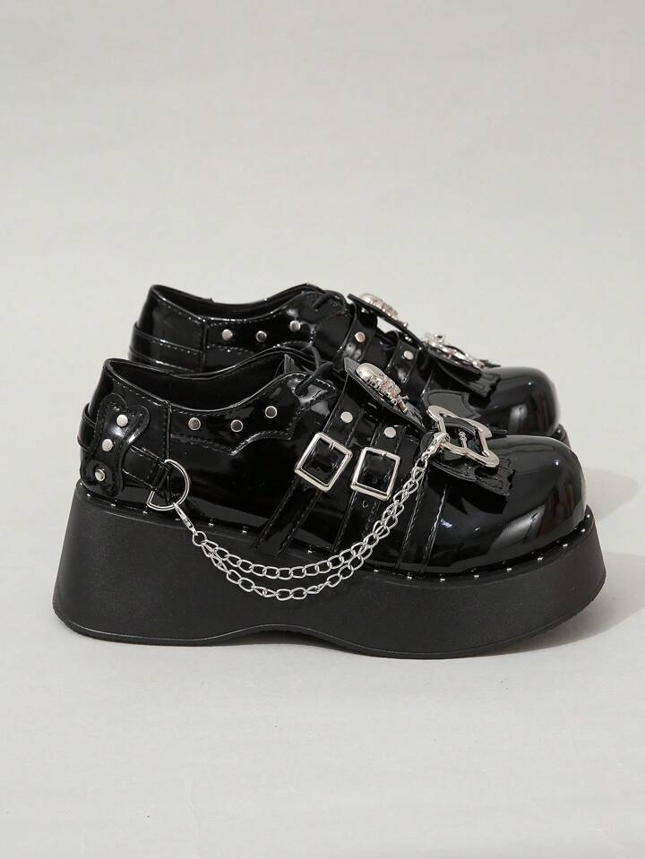 Grunge Punk Fashionable Women Black Chunky Heel Sandals With Color Block Chain Strap And Platform Sole