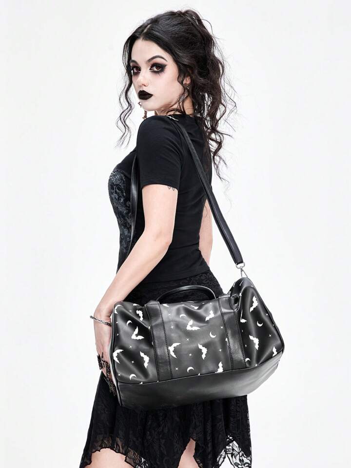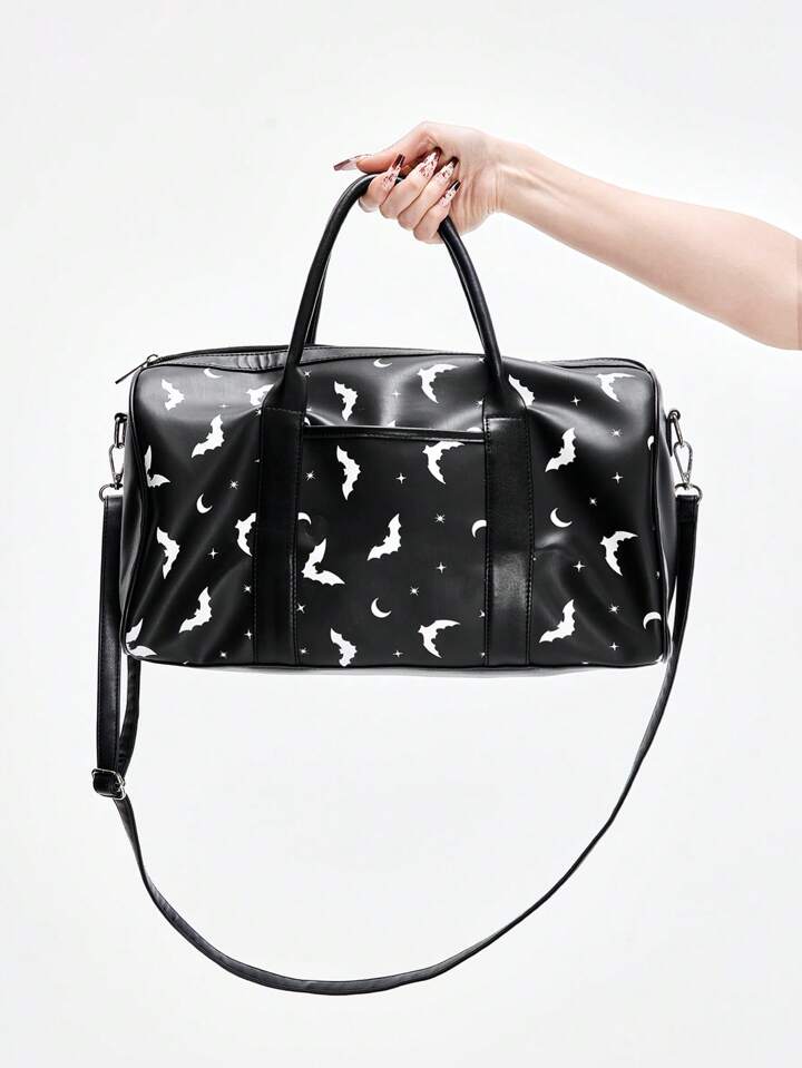 Grunge Punk Faux Leather Bat Print Travel Duffle Bag, Halloween