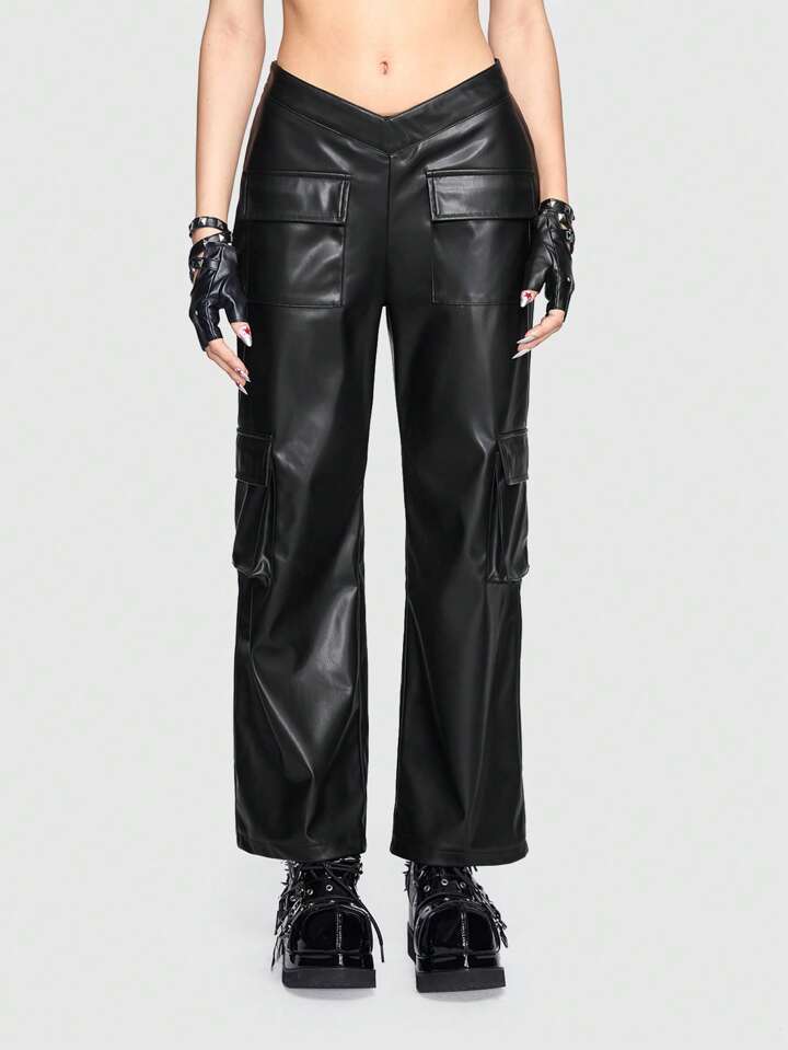 Grunge Punk Flap Pocket Side PU Cargo Pants