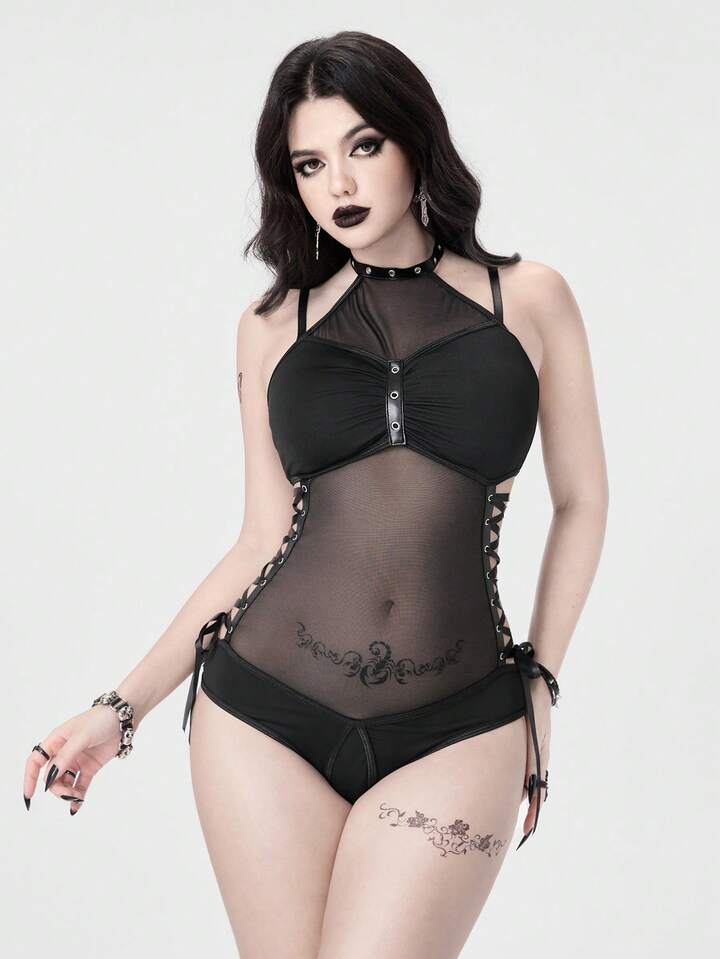 Grunge Punk Gothic Fishnet Pentagram Crotchless Bodysuit