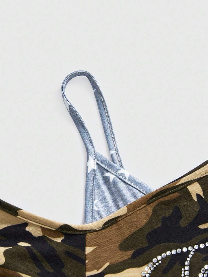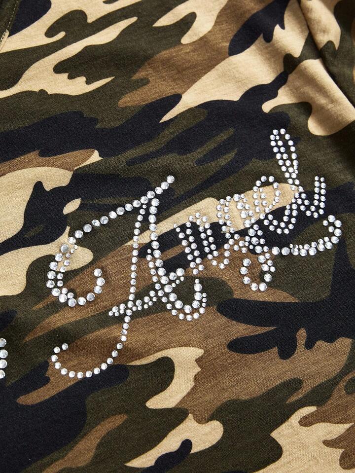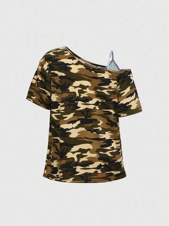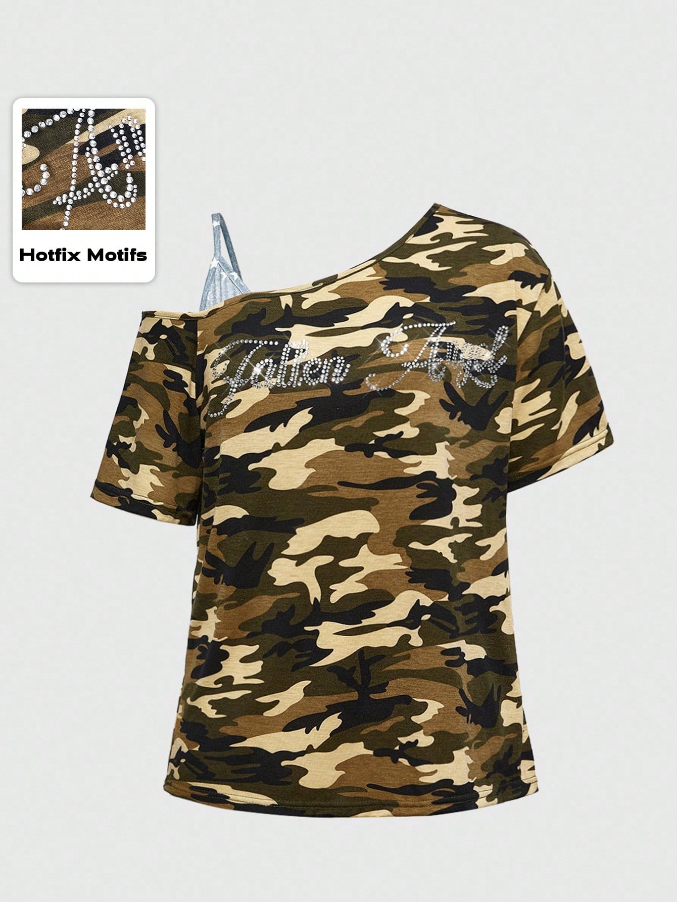 Grunge Punk Gothic Punk Wing Camo Printed Rhinestone Oblique Shoulder Loose T-Shirt For Women