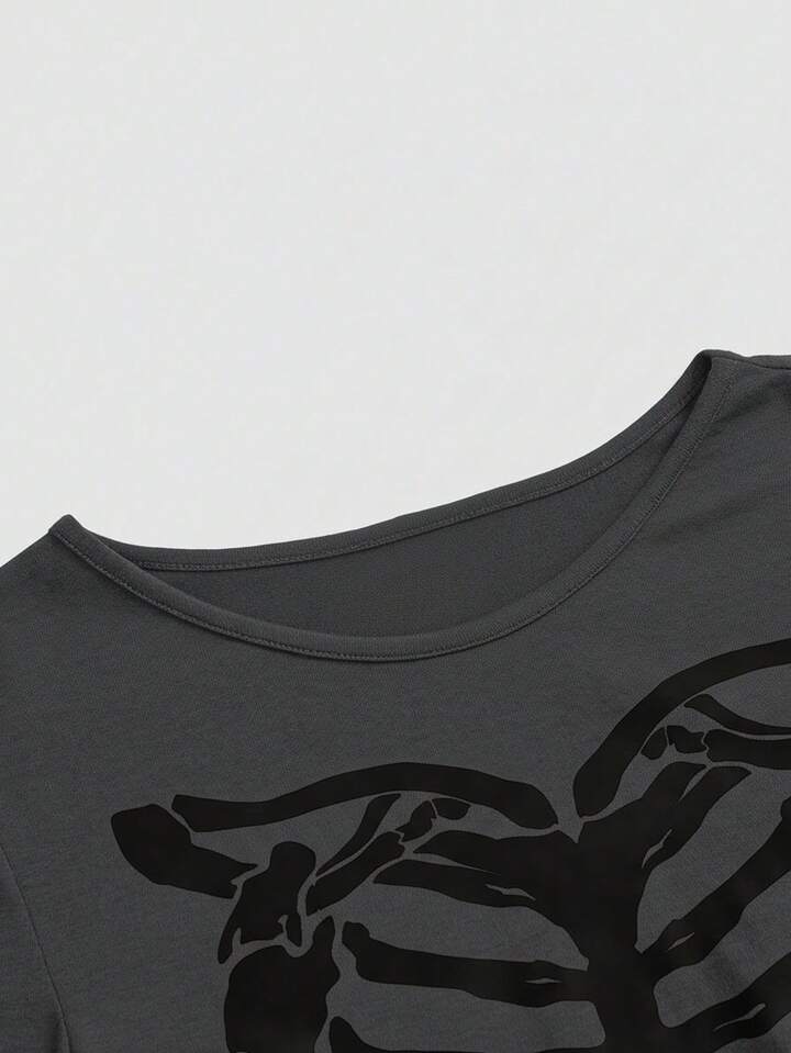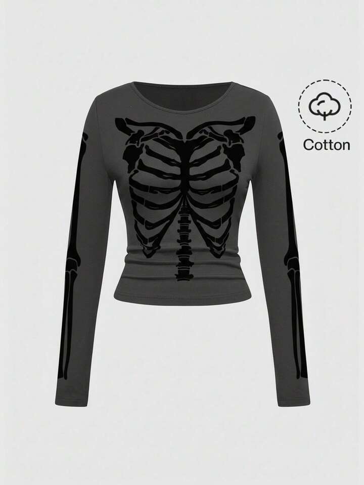 Grunge Punk Gothic Skeleton Graphic Tight Fit Round Neck Women T-Shirt, Dark & Mysterious