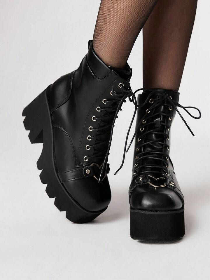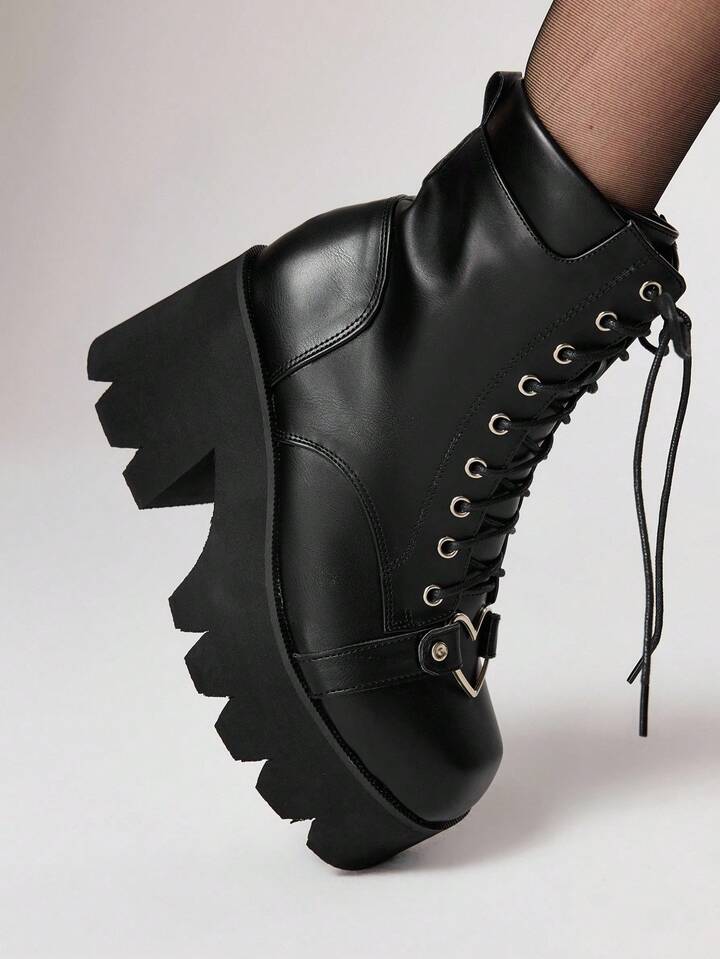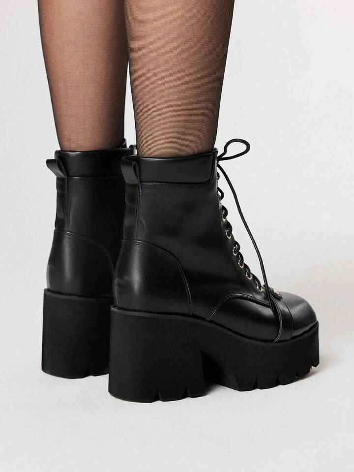 Grunge Punk Gothic Style Square Toe Chunky Heel Punk Boots, PU Leather Black High Heel Boots Suitable For Party, Daily Wear, Evening Dress, Height Increasing And Leg Lengthening, Halloween