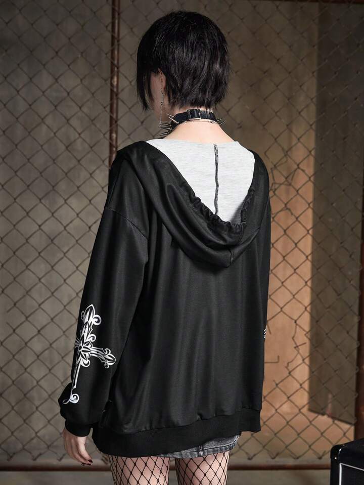 Grunge Punk Graphic Print Zip Up Drawstring Hoodie