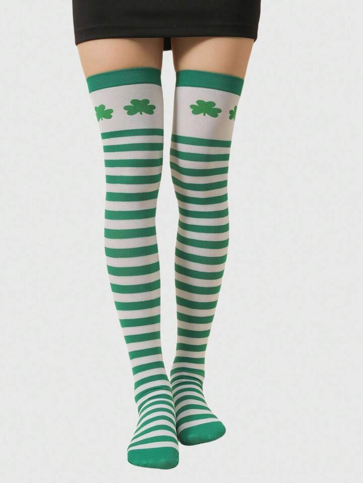 Grunge Punk Green Striped Four-Leaf Clover Random Print Pattern Thigh High Socks, Y2K Style Versatile Over-The-Knee Socks Suitable For Party, Gathering, Social Occasions
