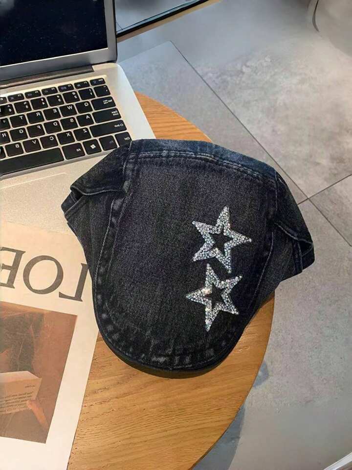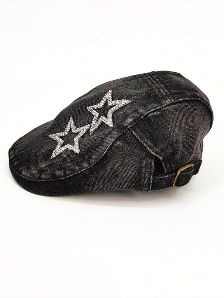 Grunge Punk Grey-Black Vintage Washed Shiny Starry Beret Hat, Summer Fashion Versatile Artist Hat Suitable For Party, Shopping, Photo-Taking