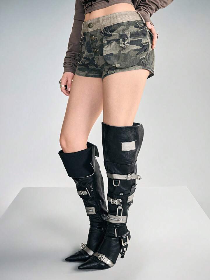 Grunge Punk Grunge Distressed Camo PU Cargo Pocket Super Low Waist Mini Denim Shorts
