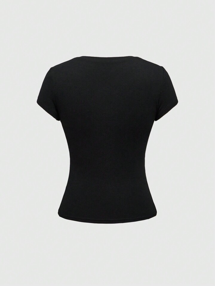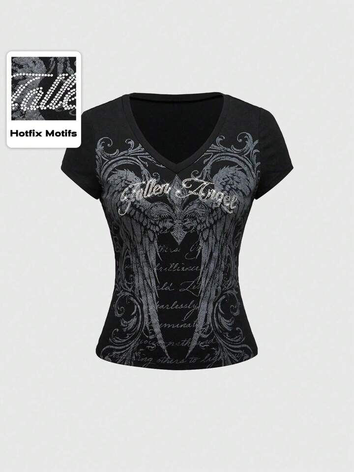 Grunge Punk Grunge Style Distressed Wing Print Rhinestone Embellished Women's Kpop Tight Fit T-Shirt