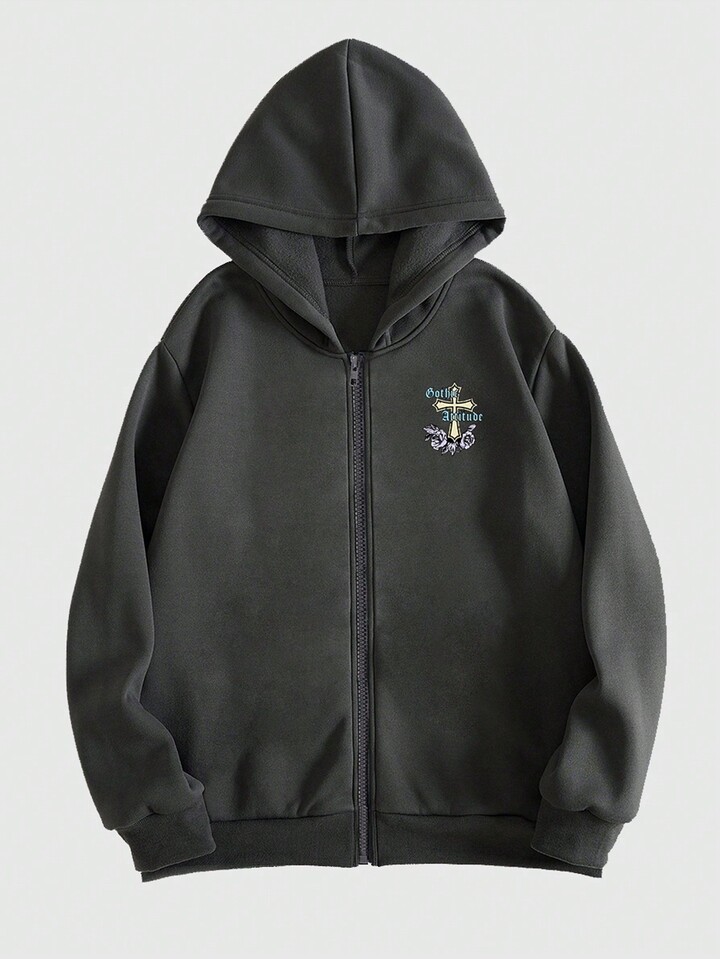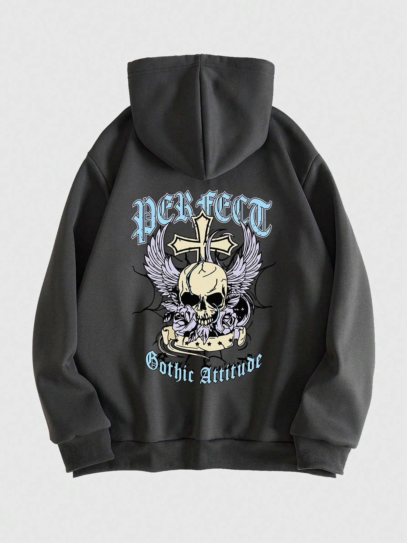 Grunge Punk Guys Skull & Letter Graphic Zip Up Thermal Lined Hoodie