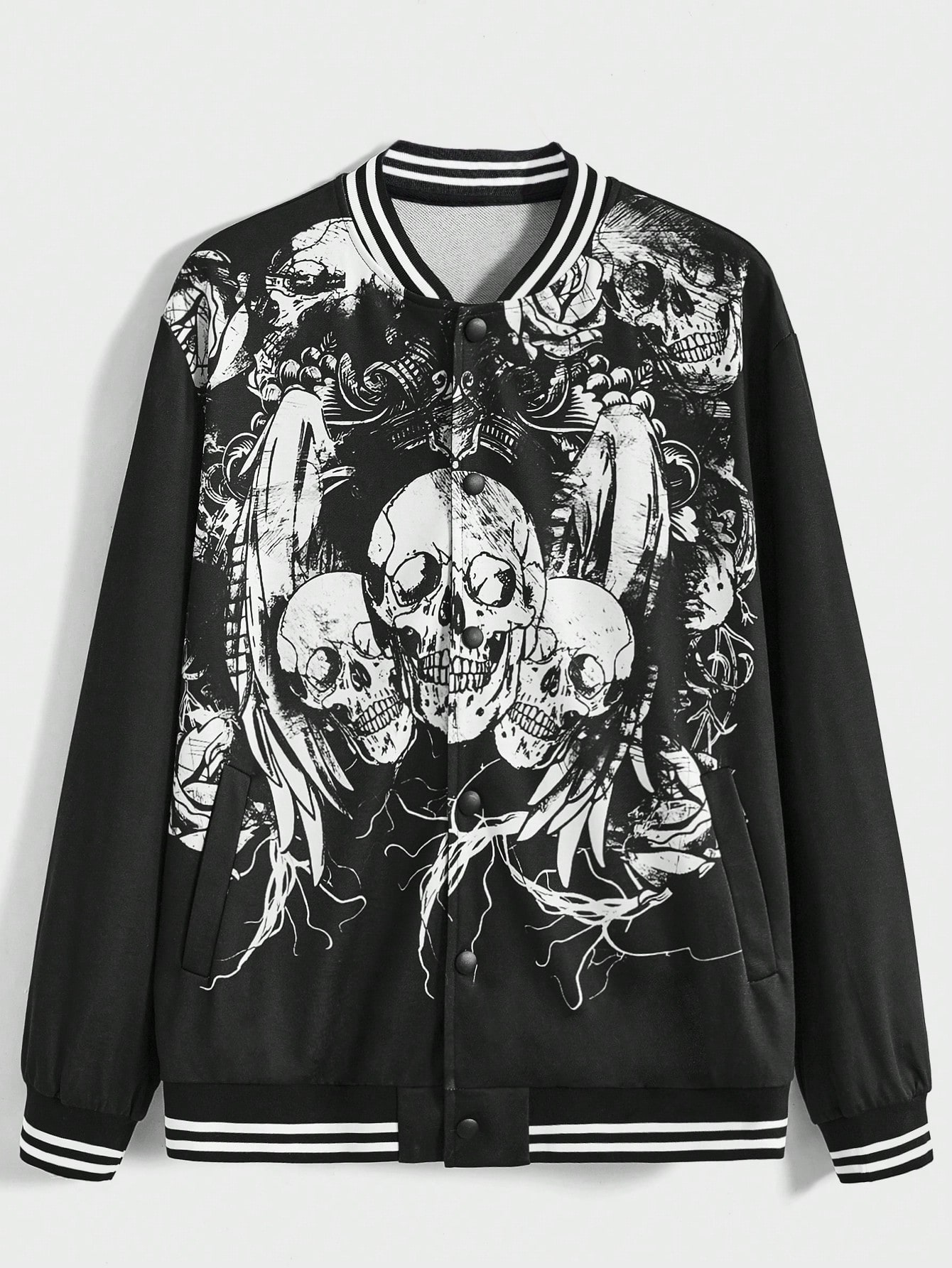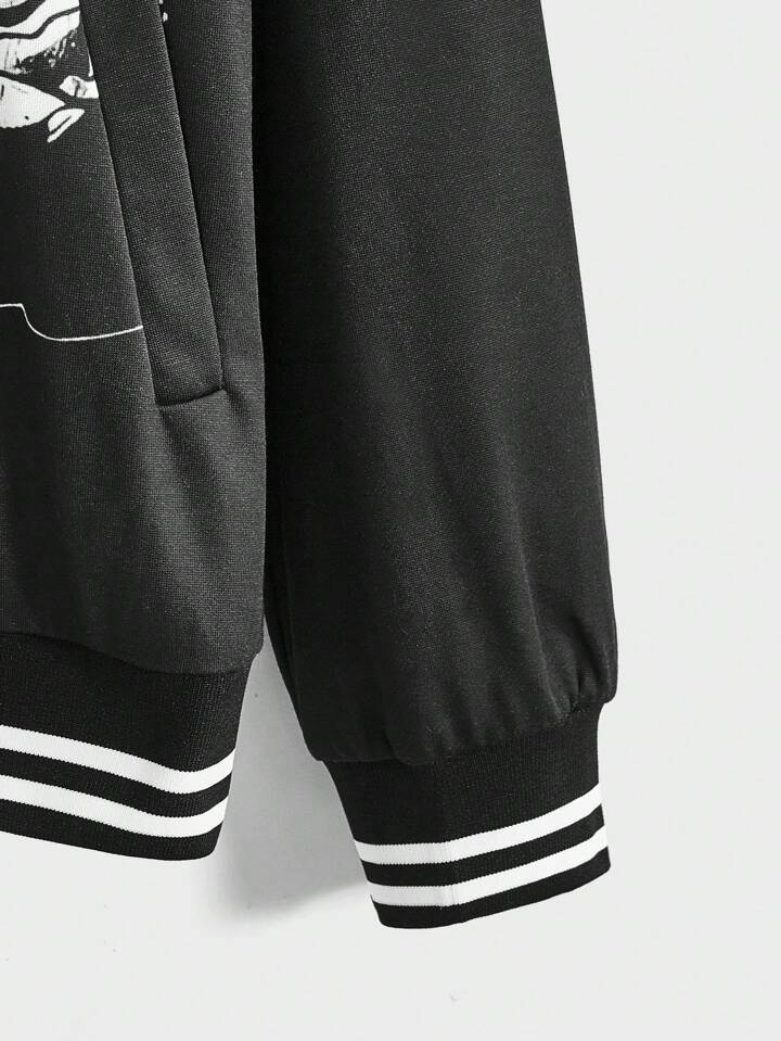 Grunge Punk Guys Skull Print Striped Trim Varsity Jacket