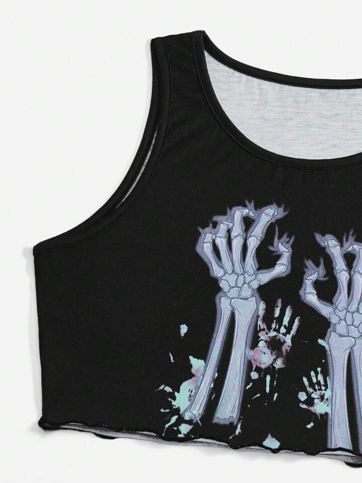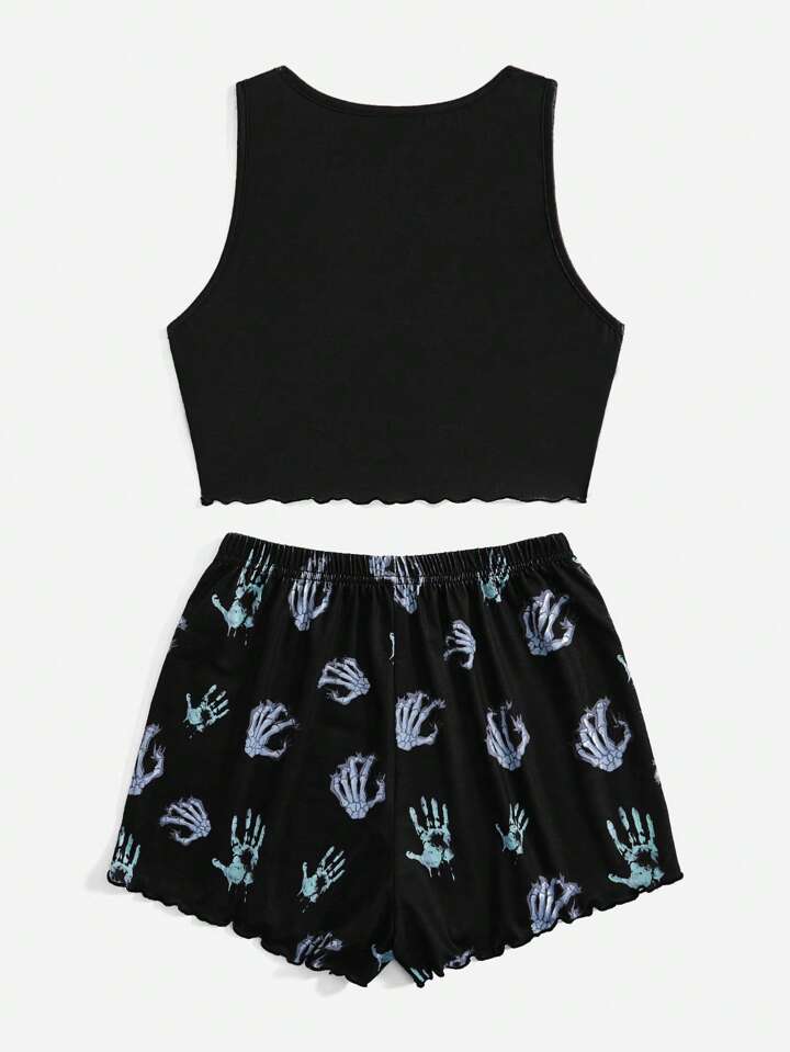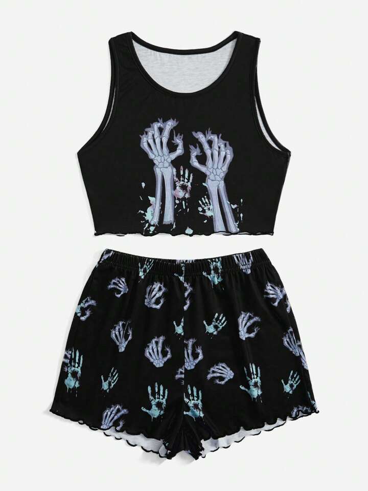 Grunge Punk Hand Skeleton Print Lettuce Trim PJ Set