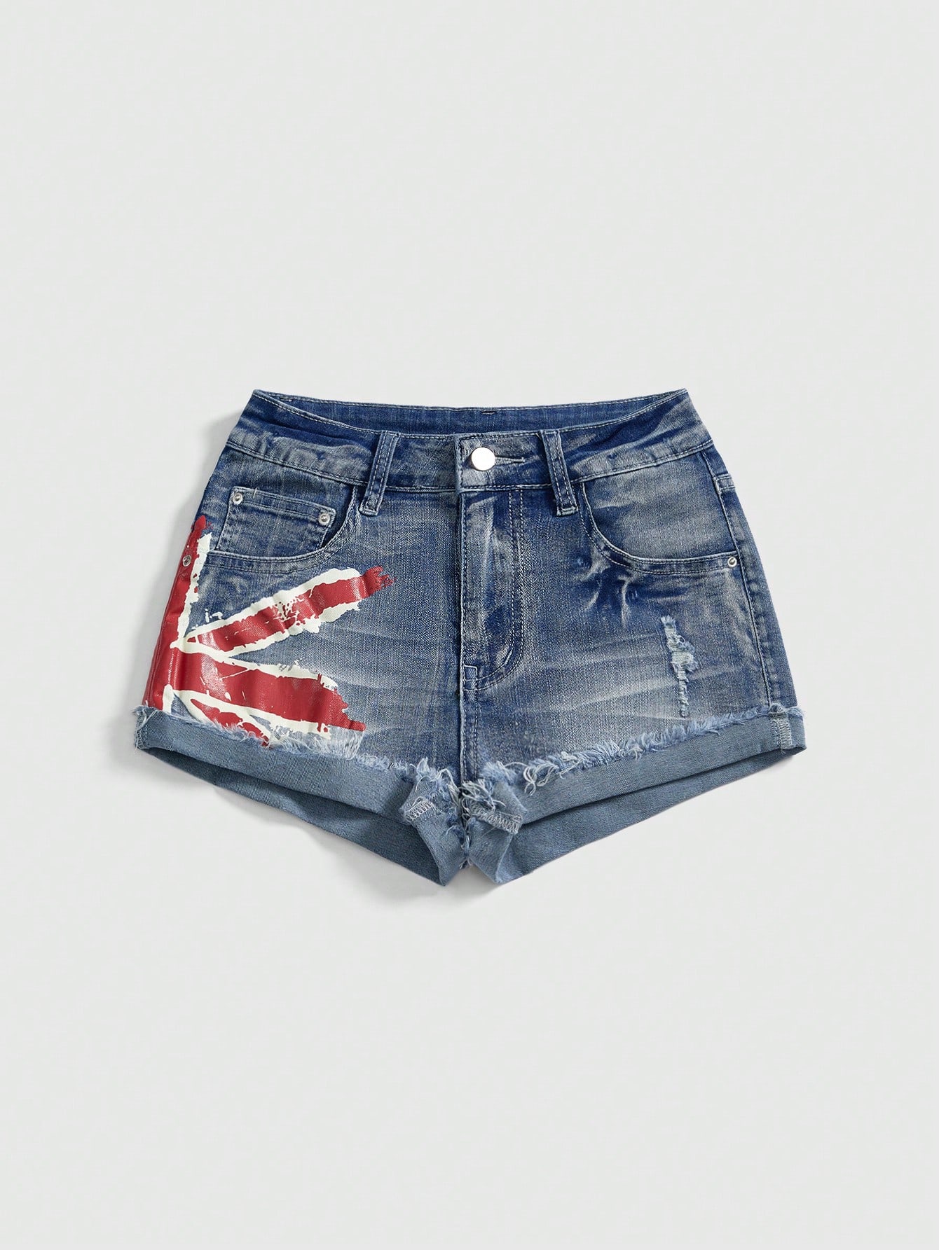 Grunge Punk Independence Day Festival, Vintage Y2K Style Union Jack Print Ultra Low Waist Denim Shorts For Women