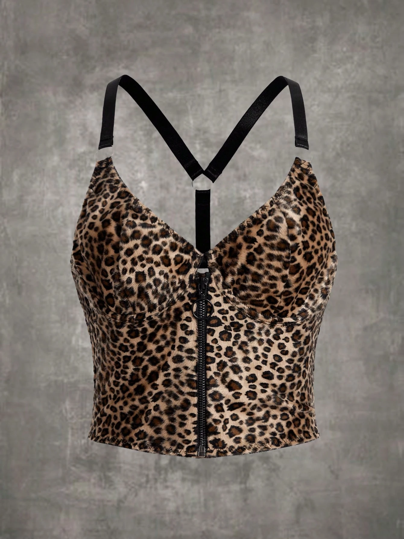 Grunge Punk Leopard Print Ring Linked Zipper Front Underwire Bra