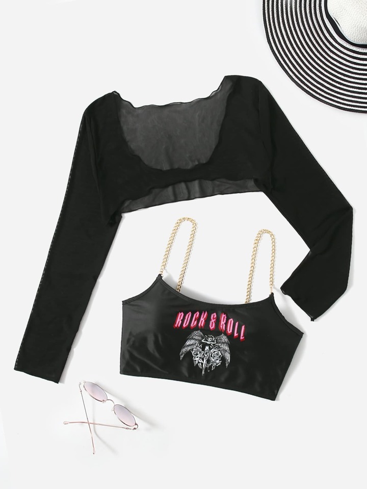 Grunge Punk Letter & Cartoon Graphic Bikini Top With Cover Up