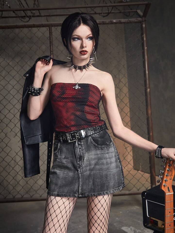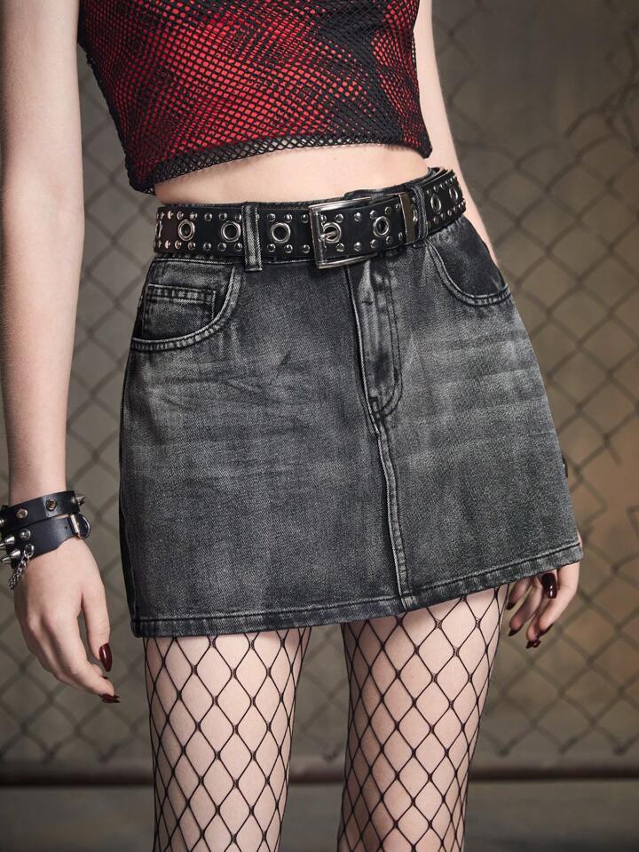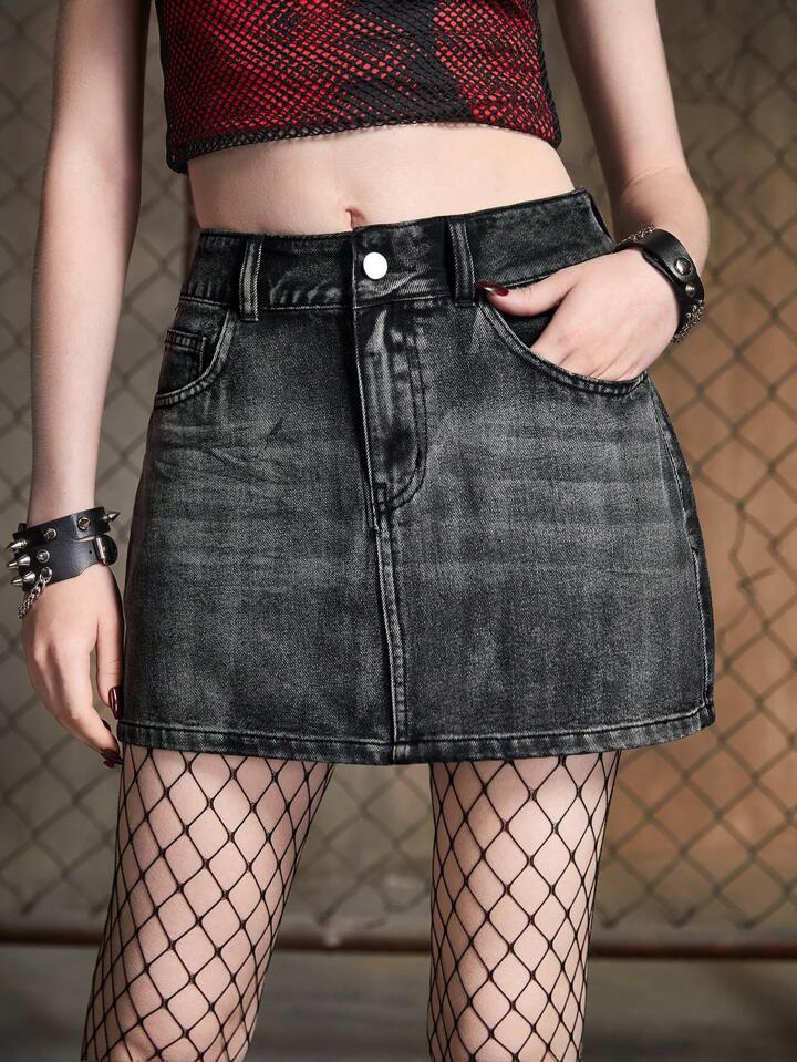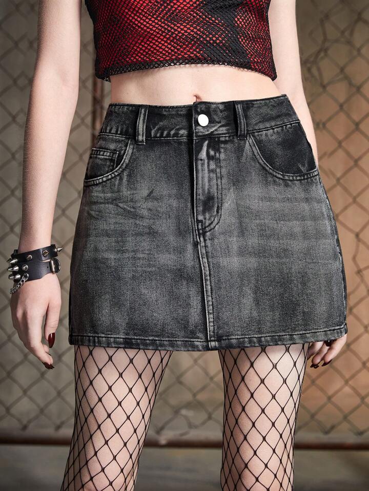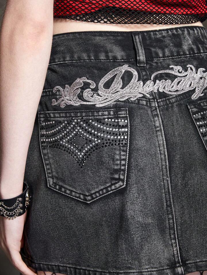 Grunge Punk Letter Embroidery Rhinestone Denim Skirt