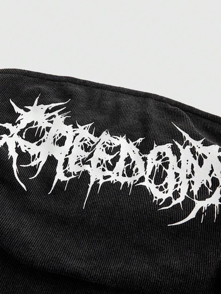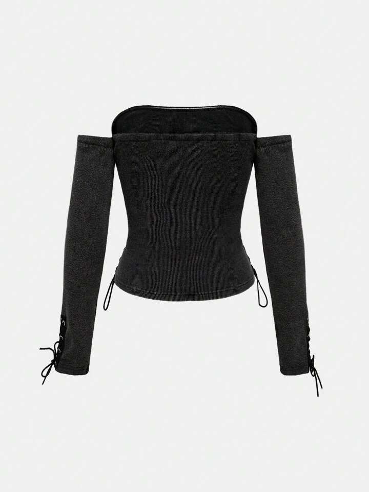 Grunge Punk Letter Print Off Shoulder Tight Fitting Women T-Shirt With Eyelets & Drawstring Design, School