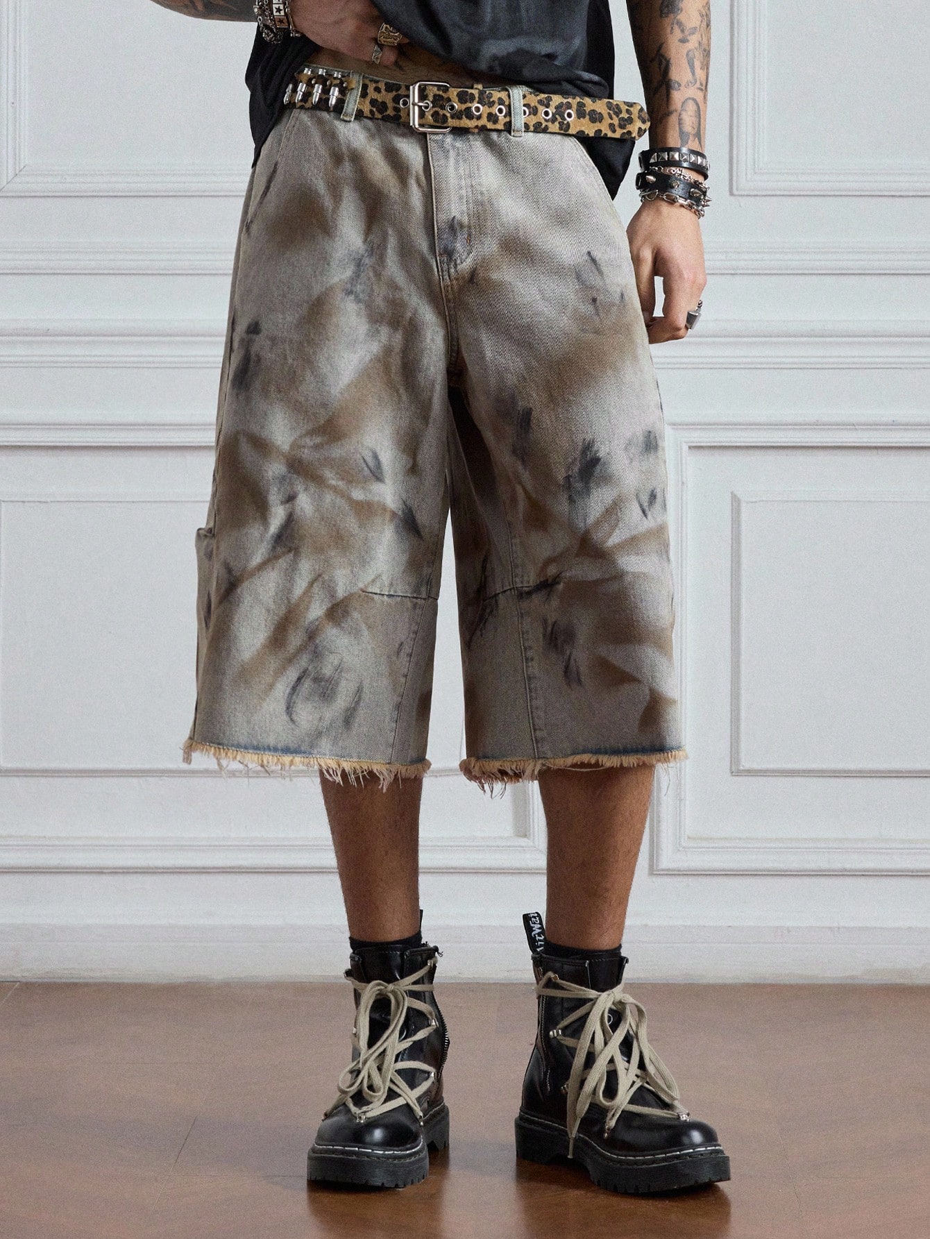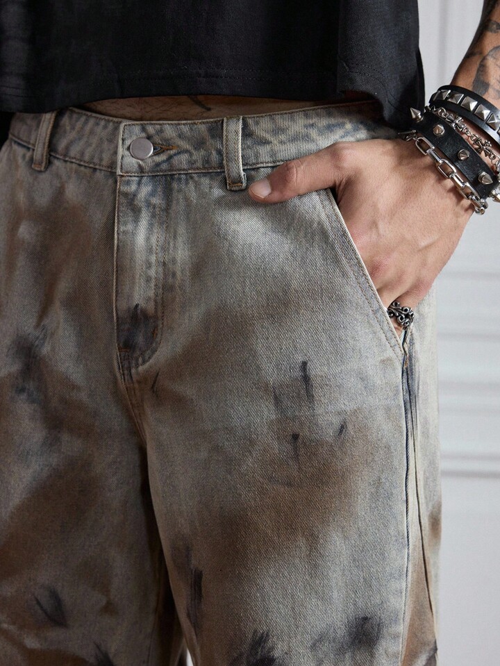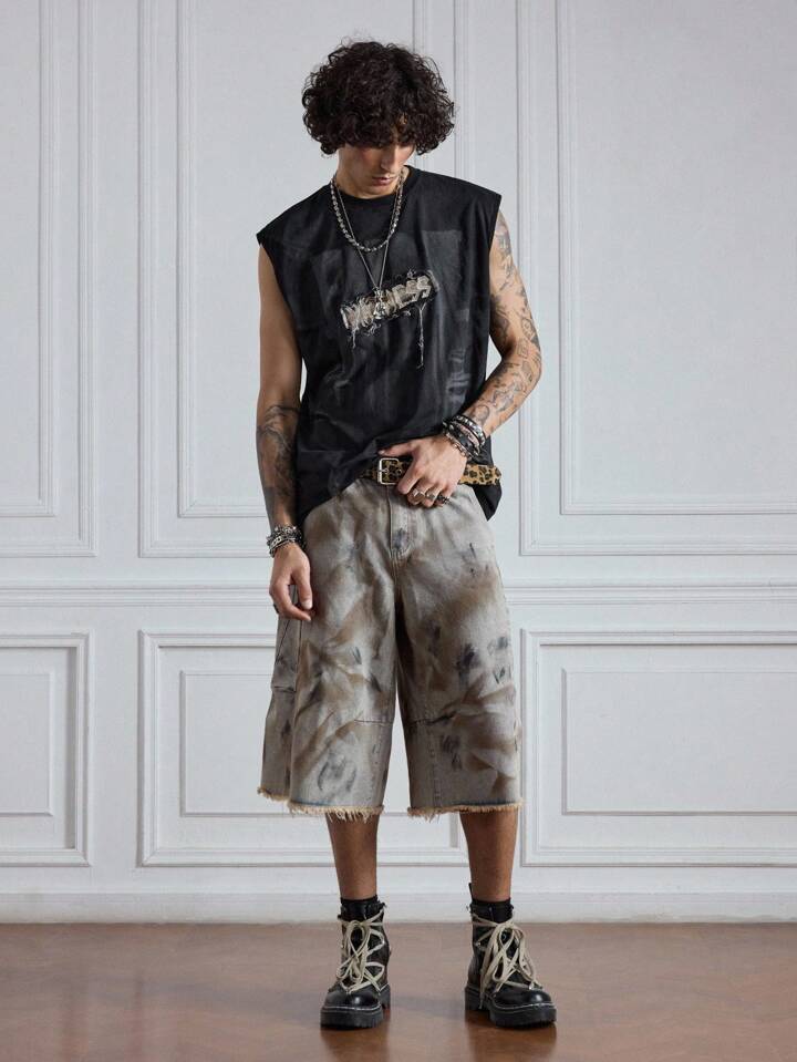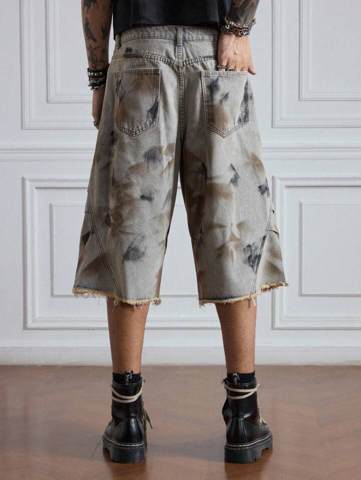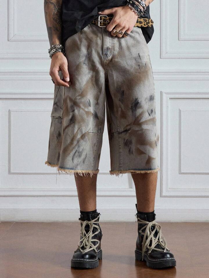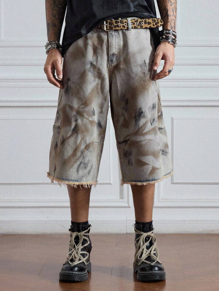 Grunge Punk Men's Batik-Dyed Frayed Hem Loose Casual Denim Shorts, Halloween