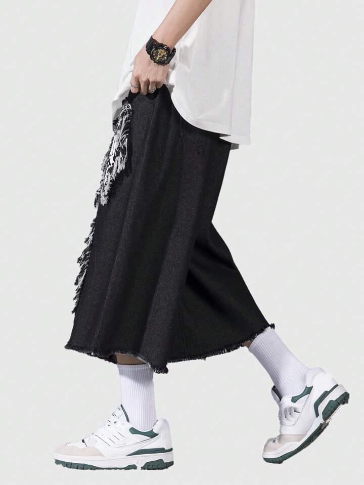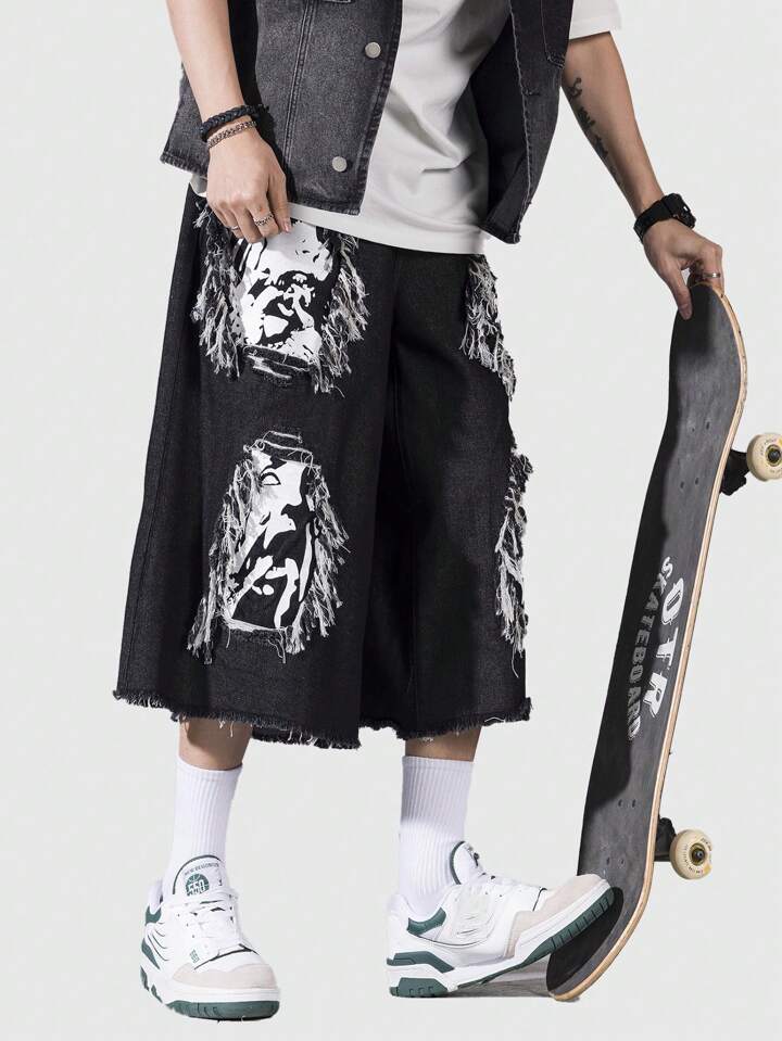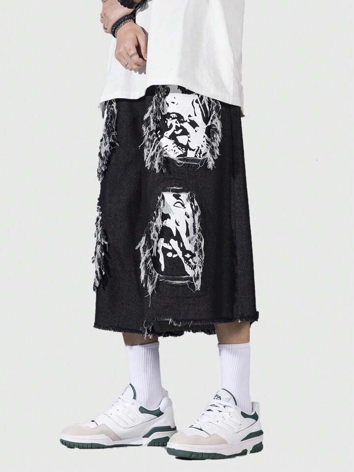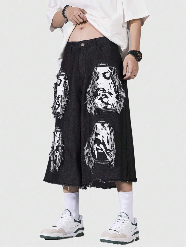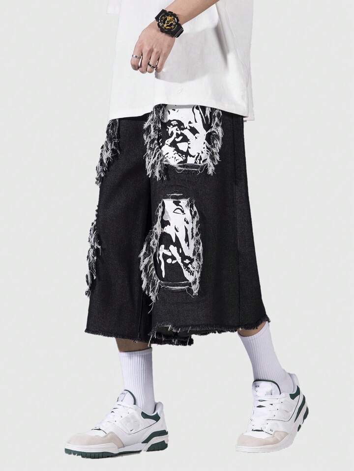 Grunge Punk Men's Personalized Print Raw Trim Baggy Capri Jeans For Daily Wear, Spring/Summer, School