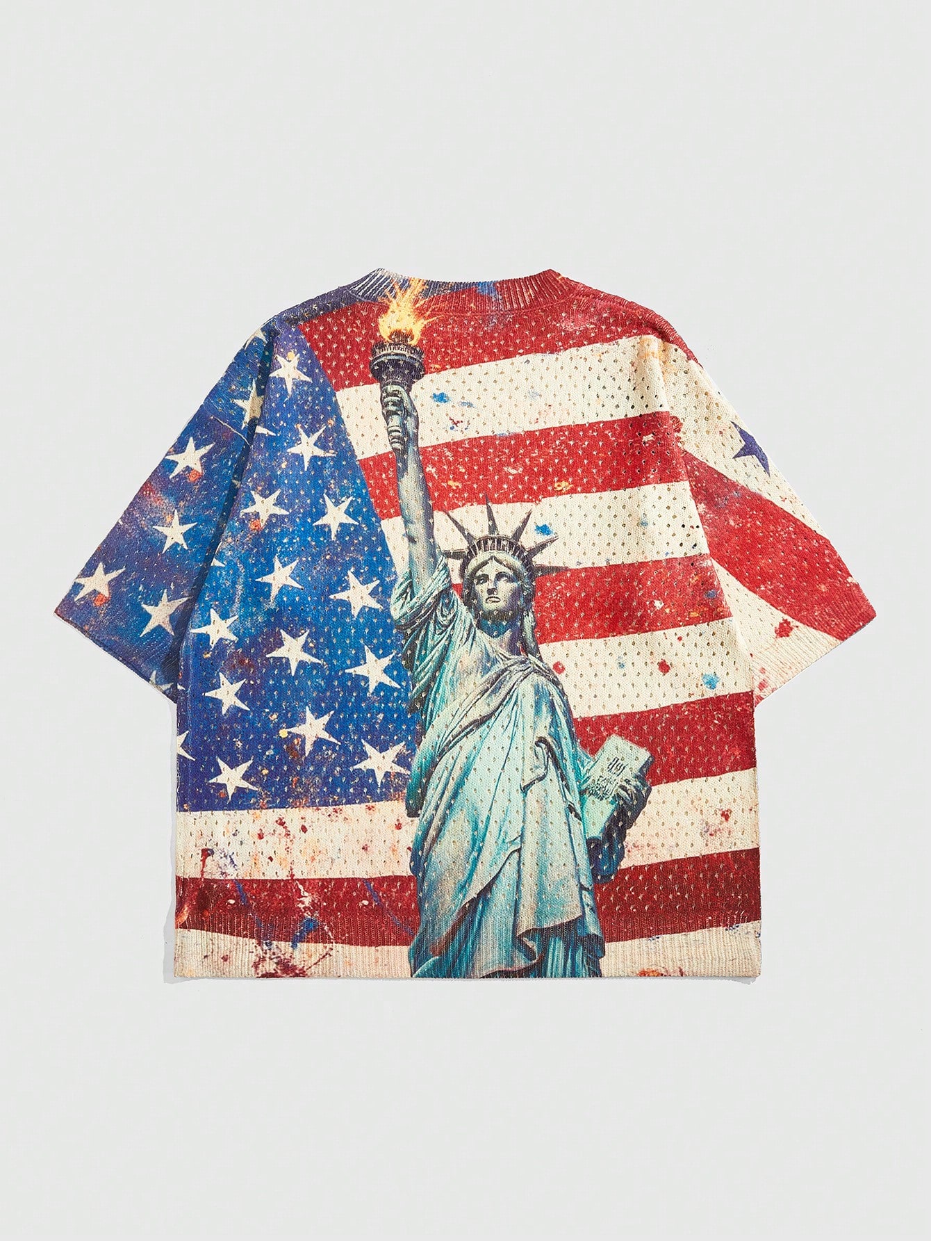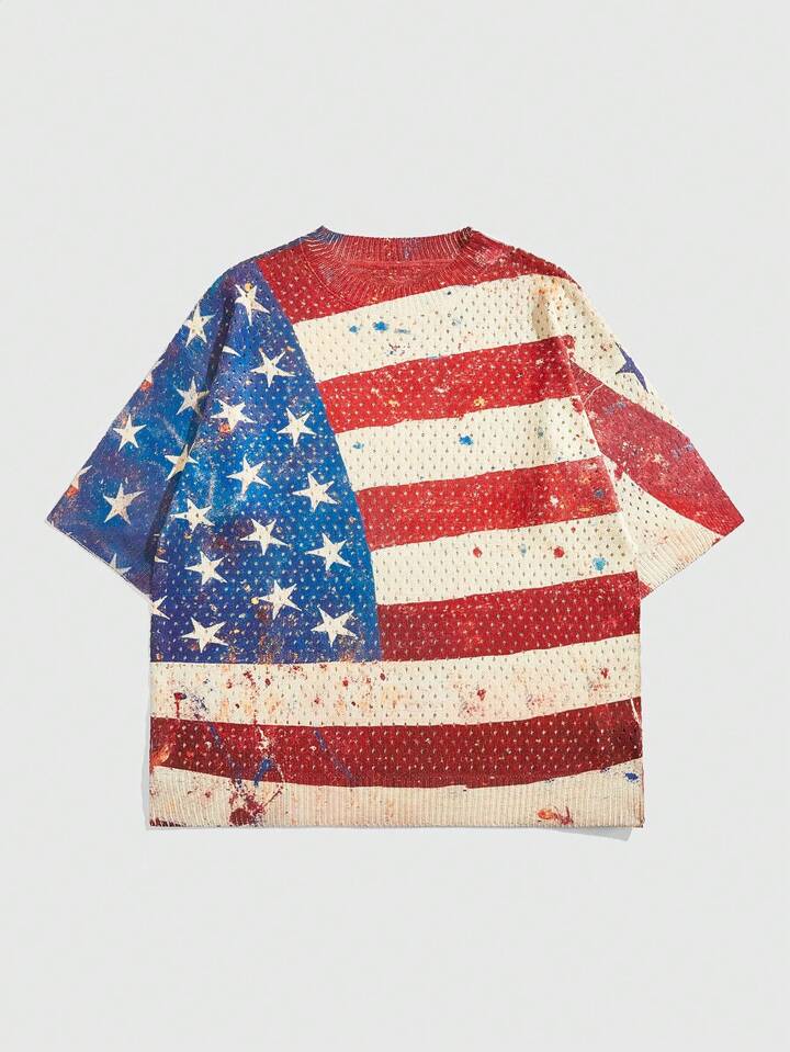 Grunge Punk Men's Punk Flag Printed Loose Drop Shoulder Short Sleeve Knitted Sweater With American Flag Pattern, Summer, 4th Of July
