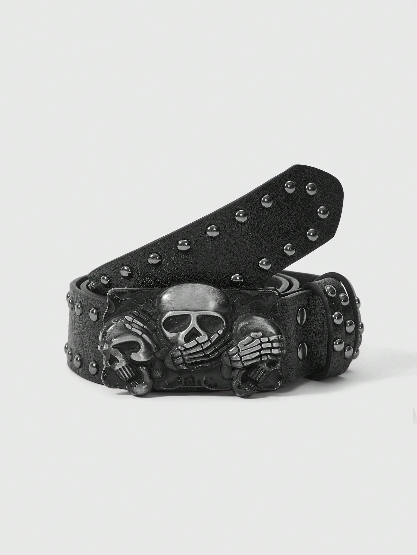 Grunge Punk New Fashionable Personalized Rhinestone Decorated Casual Leather Belt For Women, Smooth Buckle Adjustable Waist Strap With Skull Charm Halloween Summer, School Fall, Autumn, Halloween