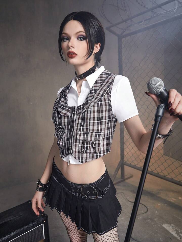 Grunge Punk Plaid Print Button Front Vest Jacket Without Shirt