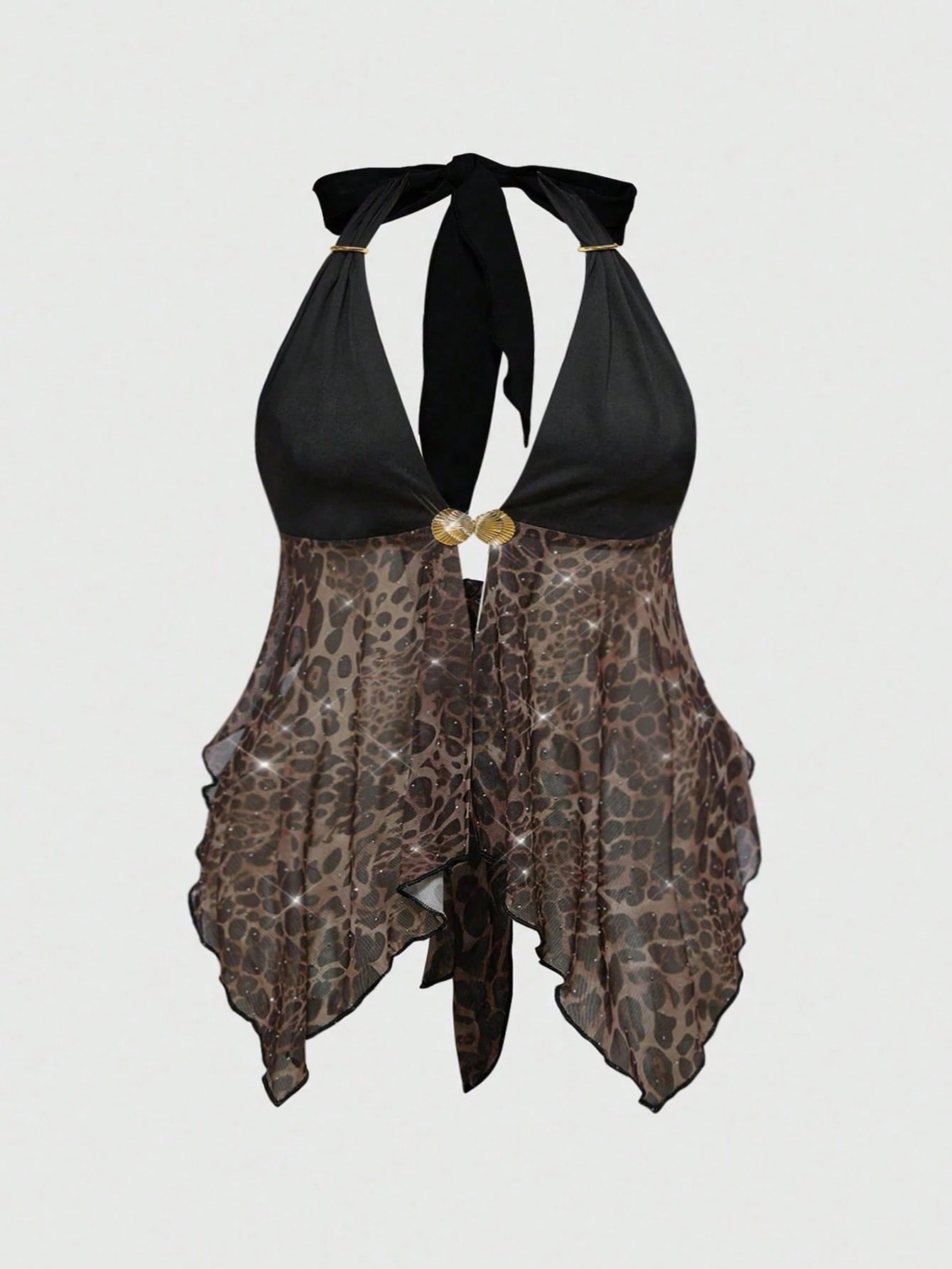 Grunge Punk Plus Size Asymmetrical Hem Leopard Print Rivet Chain Decor Tight Top For Music Festival Summer
