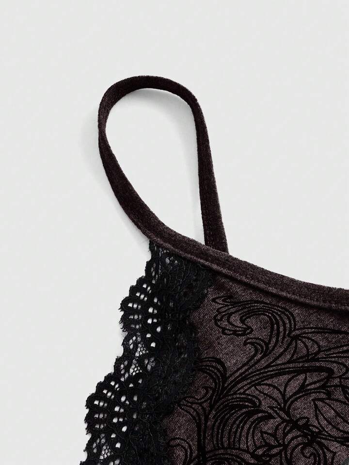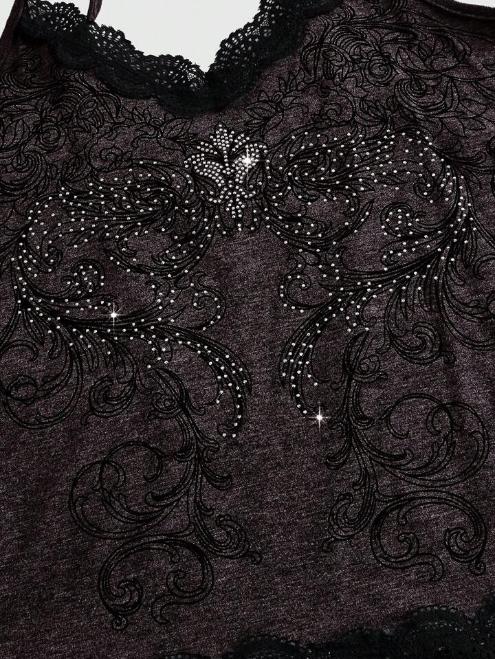 Grunge Punk Plus Size Cami Top With Lace And Rhinestone Details, Color-Blocking Design