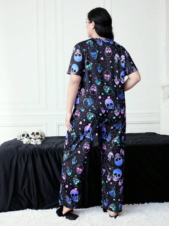 Grunge Punk Plus Size Colorful Skeleton Print Short Sleeve & Pants Sleepwear Set, Casual Home Wear