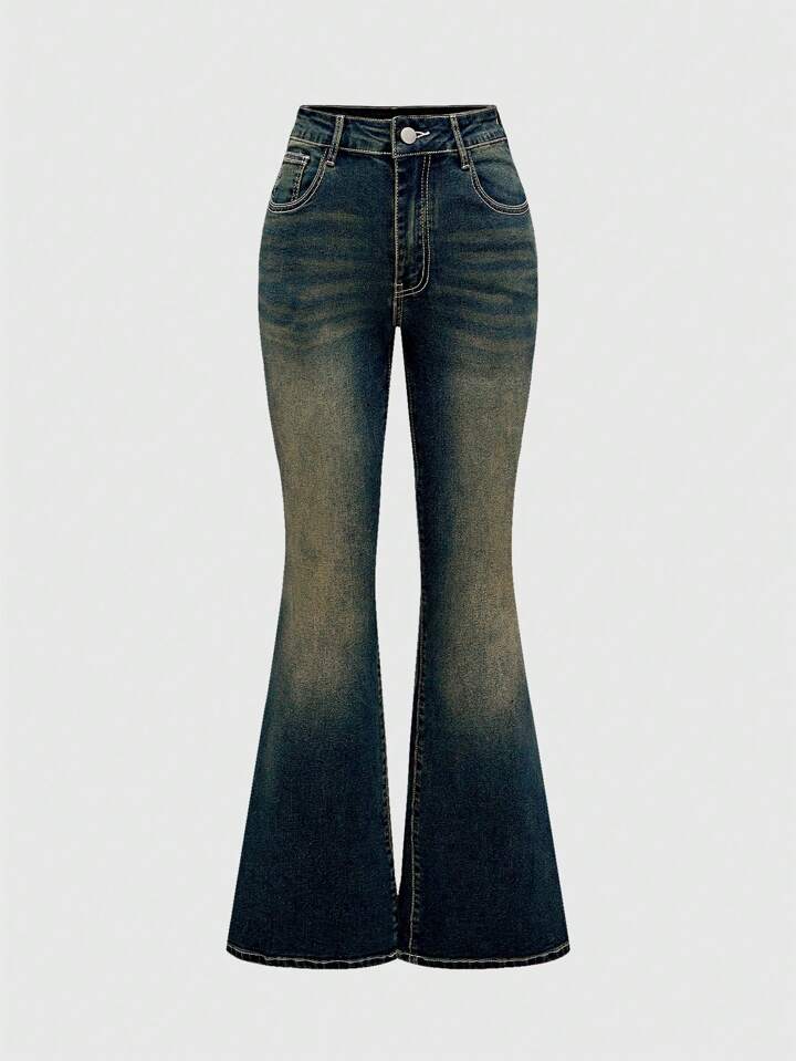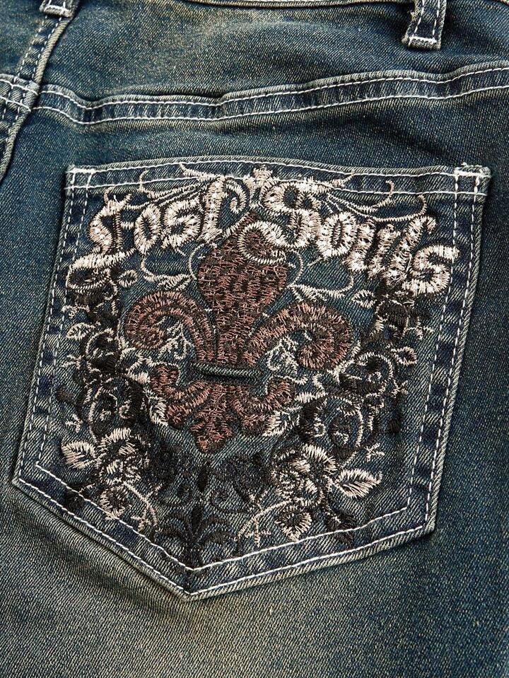 Grunge Punk Plus Size Distressed Embroidered Pocket Flare Leg Jeans