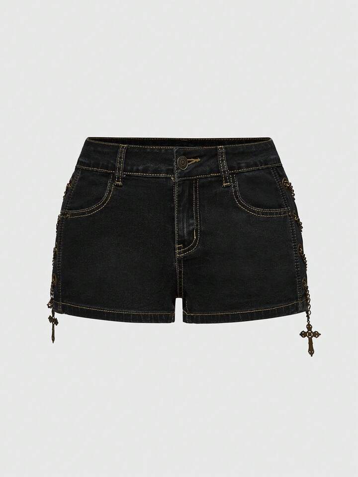Grunge Punk Plus Size Distressed Vintage Washed Side Metal Cross Decor Low Waist Mini Denim Shorts