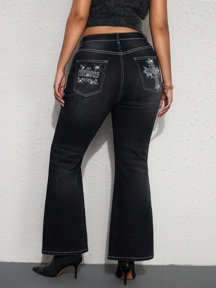 Grunge Punk Plus Size Gothic Cross Print Rhinestone Embellished Flare Jeans