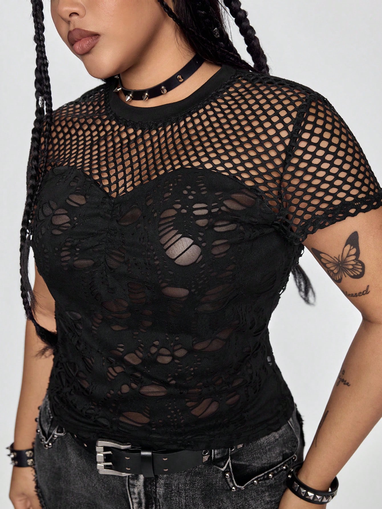 Grunge Punk Plus Size Punk Music Festival Rock Rivet Rhinestone Webbing Mesh Sexy Hollow Black Top For Women