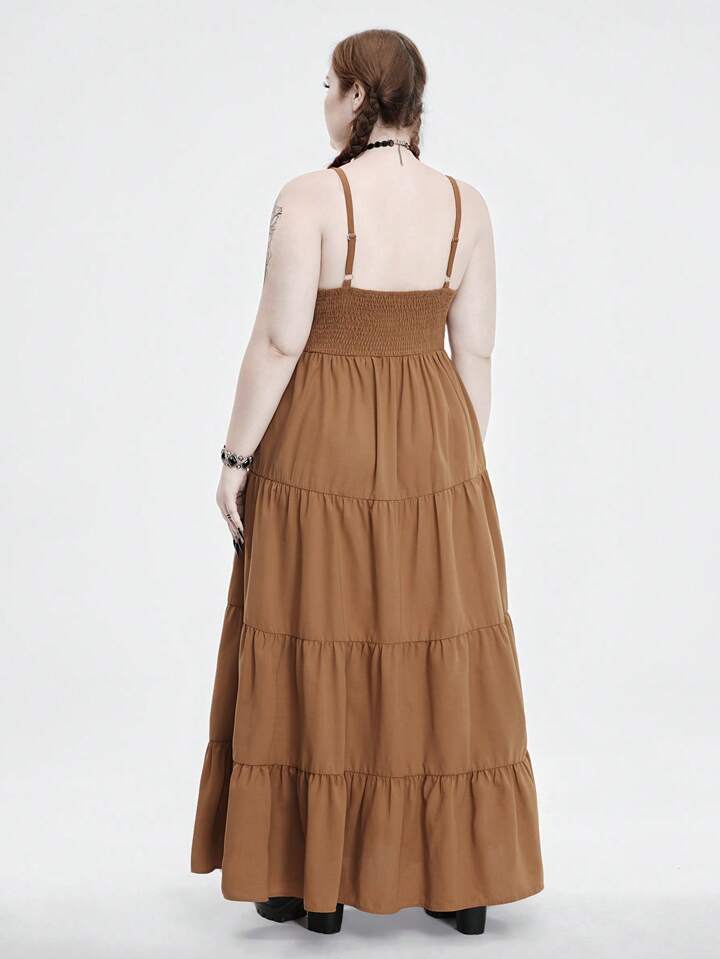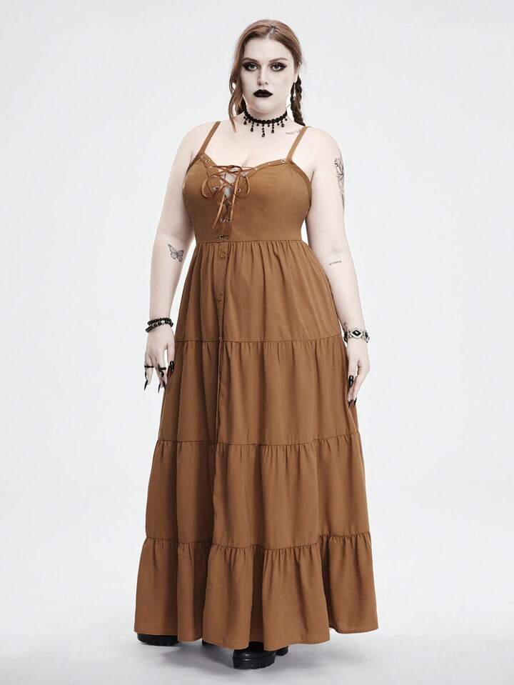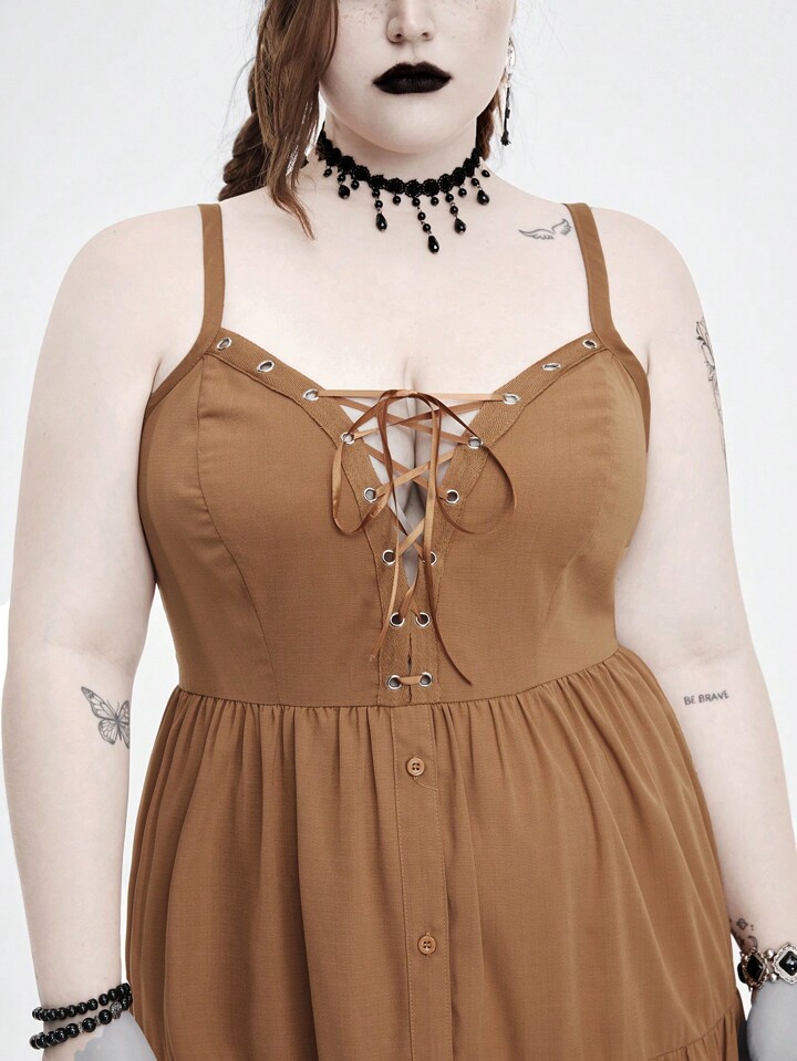 Grunge Punk Plus Size Spaghetti Strap Dress For Gothic Western Music Festival With Eyelets, Tied And Slit Design