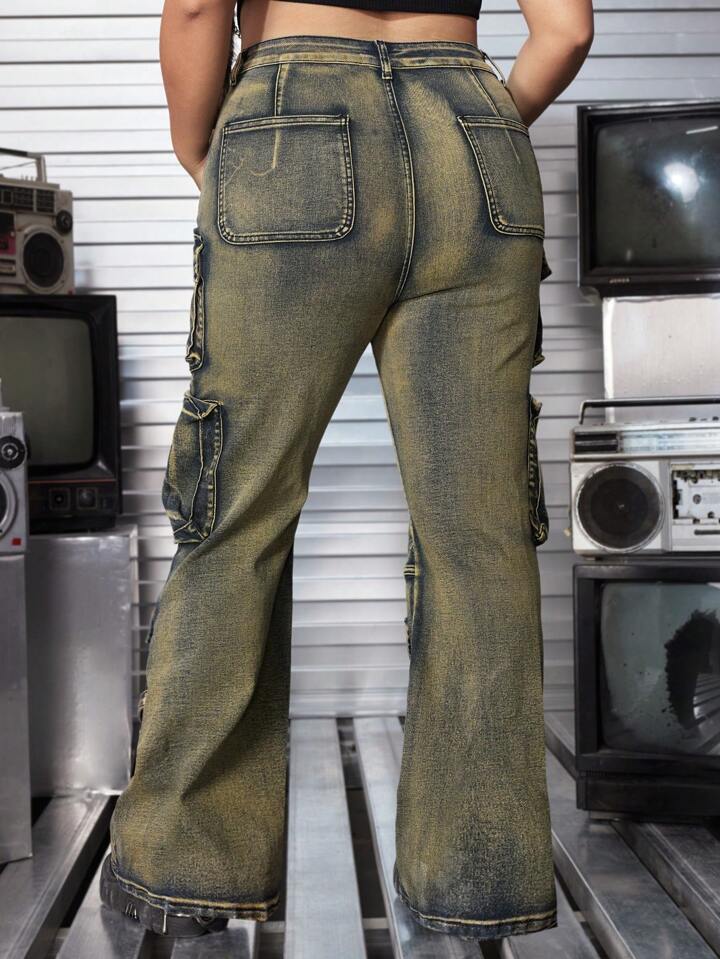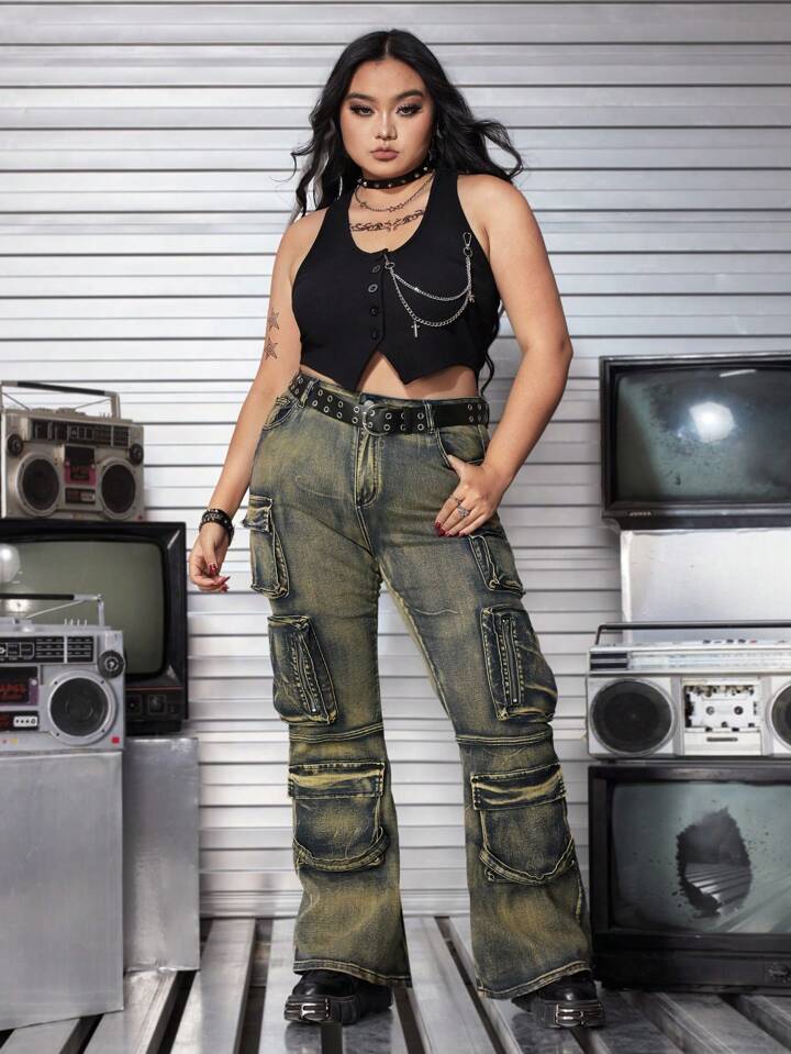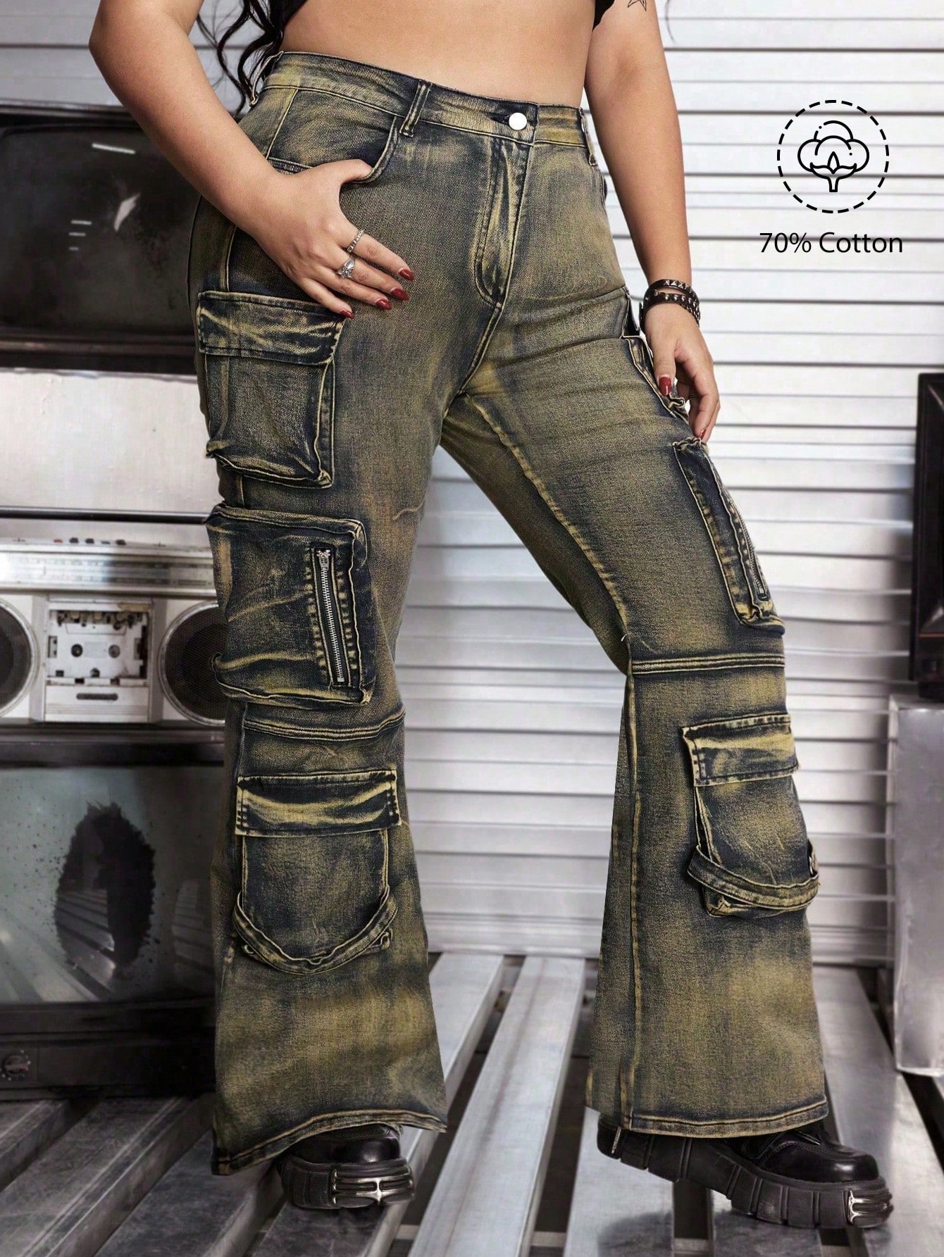 Grunge Punk Plus Size Women Distressed Flare Jeans, Wasteland Punk Street Style Cargo Pants