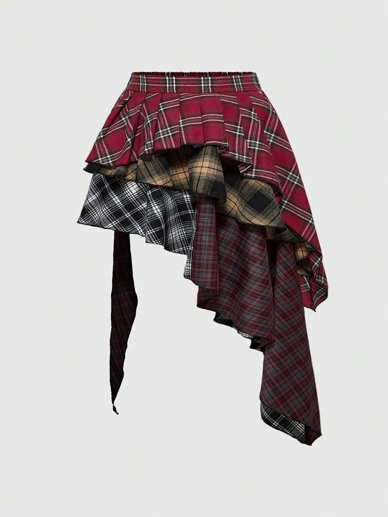 Grunge Punk Plus Size Women Grunge Vintage Grungy American Plaid Patchwork Asymmetrical Hem Layered Skirt