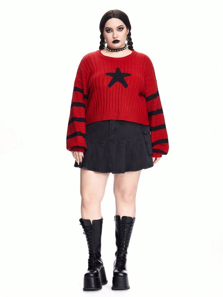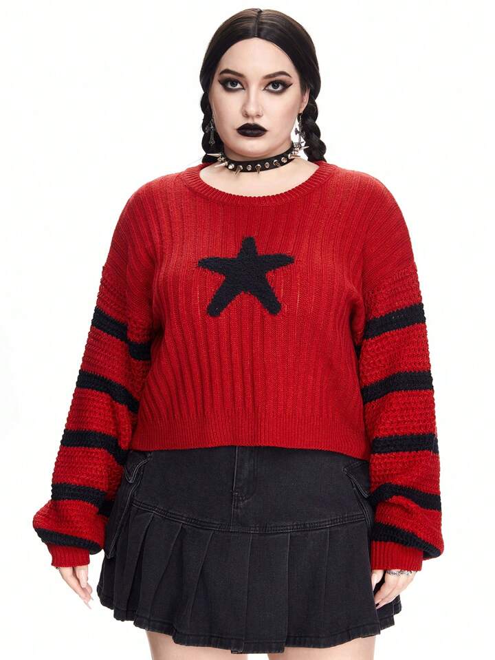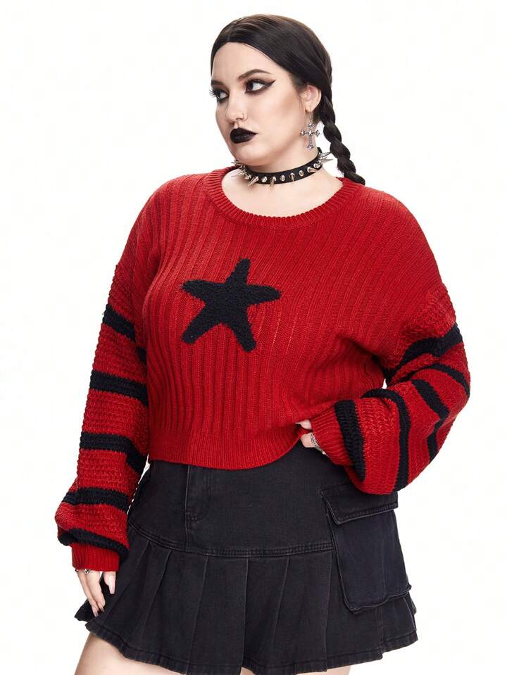 Grunge Punk Plus Size Women Punk Goth Style Star Embroidery Striped Cropped Pullover Sweater