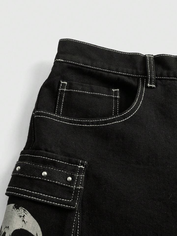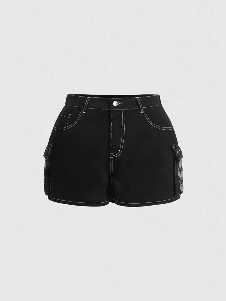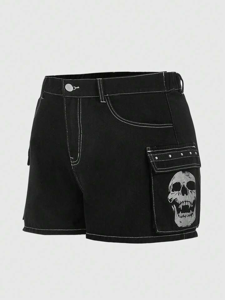 Grunge Punk Plus Skull Print Contrast Top-stitching Flap Pocket Denim Shorts